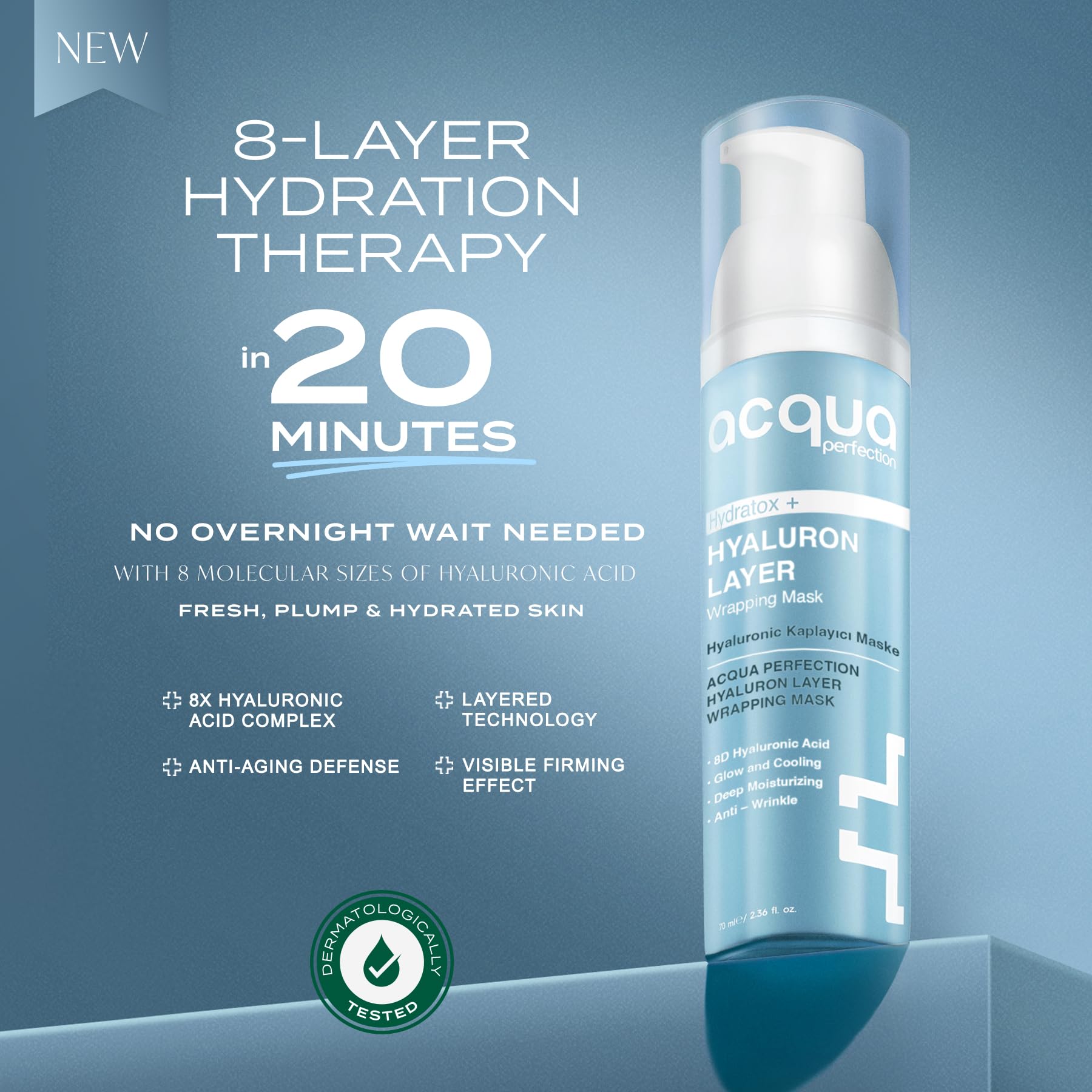 Details: Acqua Perfection’s Hydratox Wrapping Mask is a next-generation peel-off mask that hydrates, smooths, and revitalizes skin in just 20–30 minutes. Powered by multi-molecular Hyaluronic Acid, Niacinamide, Panthenol, Avocado Oil, and Coconut Oil, the lightweight gel forms a moisture-locking film that delivers deep hydration and visible plumping without overnight waiting. Skin feels refreshed, elasticity looks improved, and fine lines appear reduced. With Aloe Vera and Zinc PCA, this formula also soothes and balances for a radiant, healthy-looking glow. How to Use: Apply ~5 mL to cleansed skin as the last step of your routine. Spread an even, thin layer, avoiding the eyes and lips. Leave for 20–30 minutes until dry. Gently peel off from edges and massage any remaining essence into skin. Size: 70 mL (2.37 fl oz). Safety: For external use only. Avoid eyes, wounds, or cuts. Patch test before first use. Discontinue if irritation occurs. Store at room temperature, away from direct sunlight. Keep out of reach of children. Made in Türkiye. 8684272601084 Backend Search Terms (generic_keywords) hydrating face mask moisturizing face mask anti wrinkle face mask peel off mask hyaluronic acid face mask niacinamide mask panthenol mask avocado oil face mask coconut oil mask smoothing face mask glow mask
