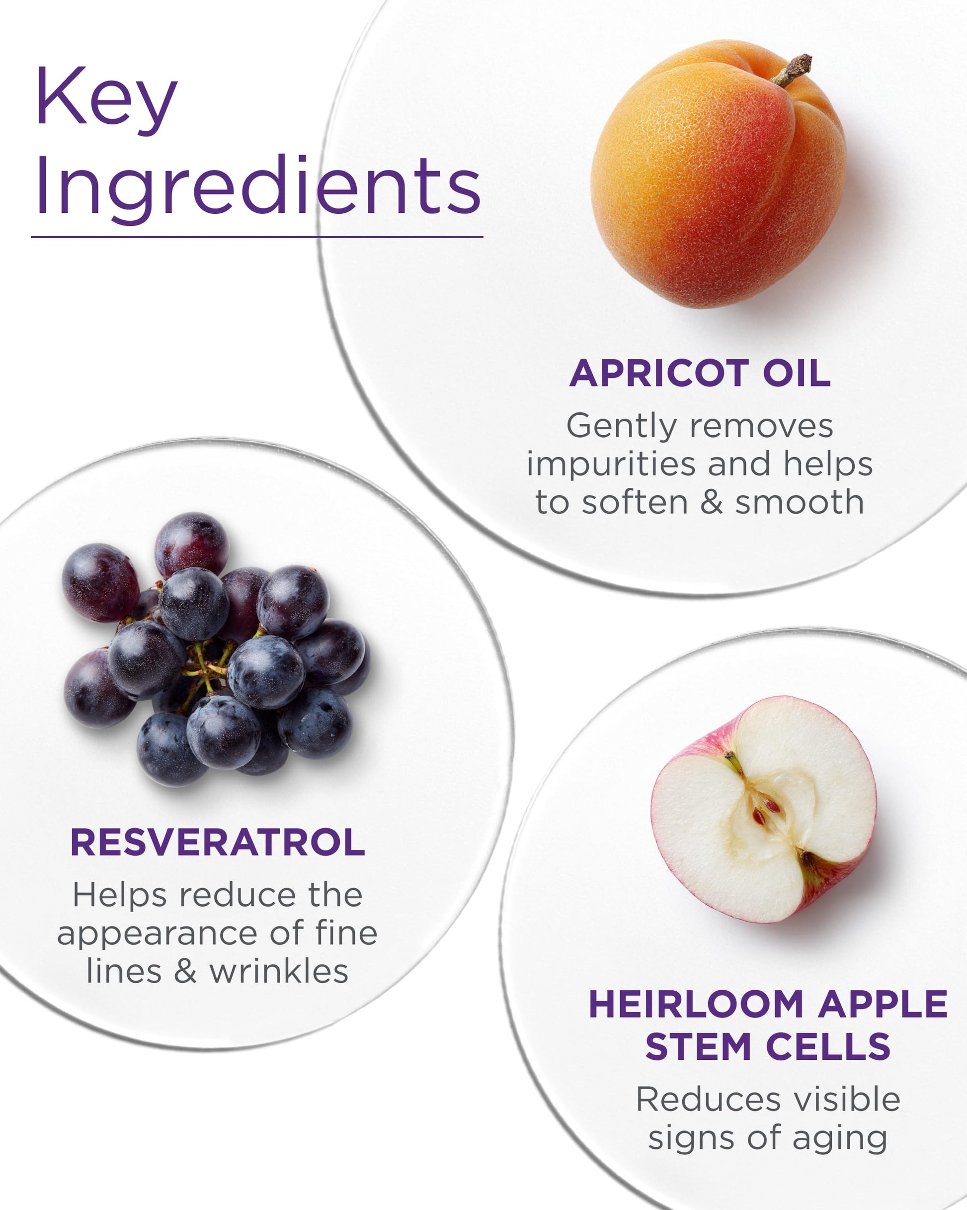 Gentle daily cleanser: Fruit Stem Cell complex from apple & grape, Resveratrol CoQ10, and vegan probiotics gently remove makeup & impurities, rinsing away dull surface cells and balancing skin flora.