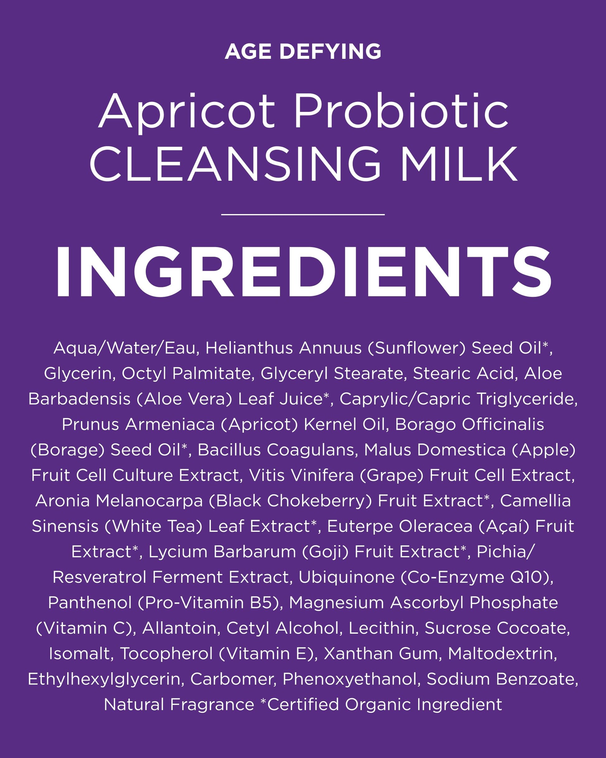Andalou Naturals Apricot Probiotic Cleansing Milk combines the power of probiotics, resveratrol CoQ10, blended with apricot and borage oils, to effortlessly cleanse makeup and impurities without stripping the skin. Formulated with a potent Fruit Stem Cell complex derived from apple and grape, along with Resveratrol CoQ10 and vegan probiotics, this cleansing milk gently removes dull surface cells while restoring the natural balance of your skin's microflora.