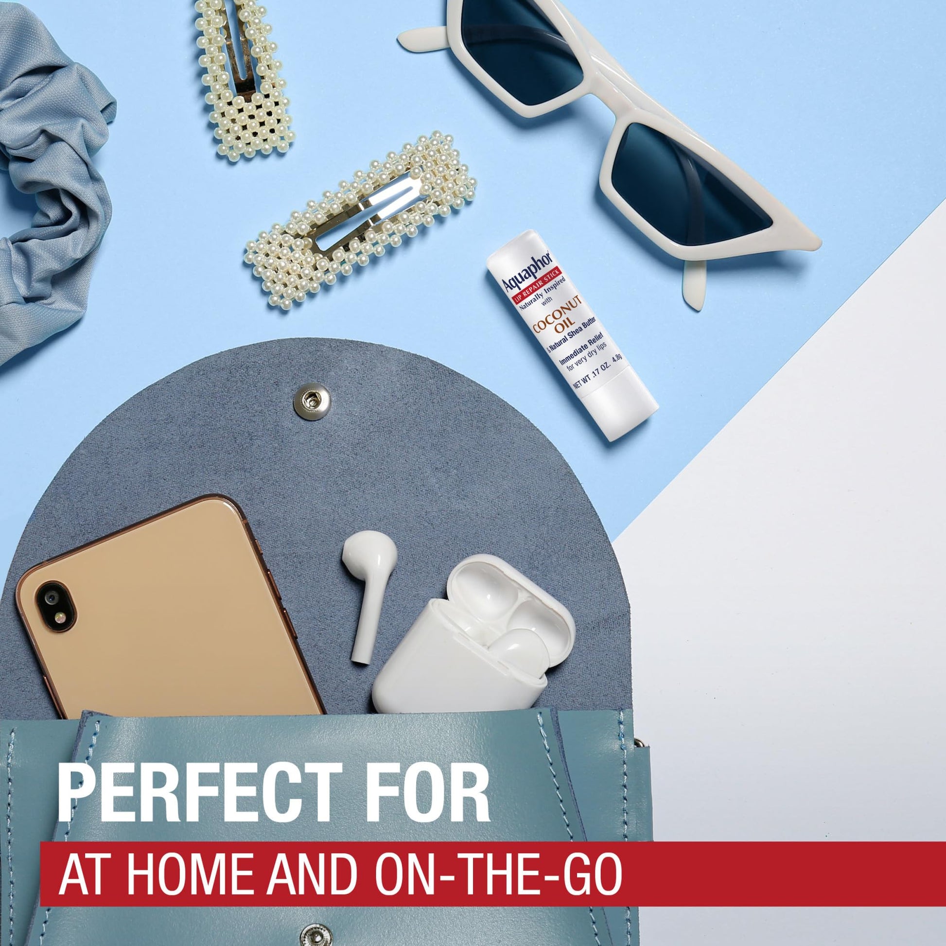 Details: Find long-lasting moisture from the #1 dermatologist recommended lip care brand with Aquaphor Naturally Inspired Lip Repair Stick with Coconut Oil. Aquaphor Naturally Inspired Lip Repair Stick immediately relieves dryness and soothes chapped lips. This moisturizing lip balm stick is gentle on sensitive skin and leaves lips feeling soft and hydrated, so lips look and feel healthier. Formulated with 99% naturally derived ingredients*, this lip repair stick contains nourishing vitamins and Natural Shea Butter. Aquaphor Naturally Inspired Lip Repair Stick glides on easily for a smooth application and is great for use in dry, cold or windy conditions. Apply this Aquaphor lip balm stick liberally to dry or chapped lips as often as needed. Each of the ingredients in Aquaphor lip care products are tested and approved for their quality and safety. *Naturally derived ingredients including purified water, have undergone processing while maintaining a majority of their molecular structure. Skin safe synthetics are included to maintain the integrity of the product.