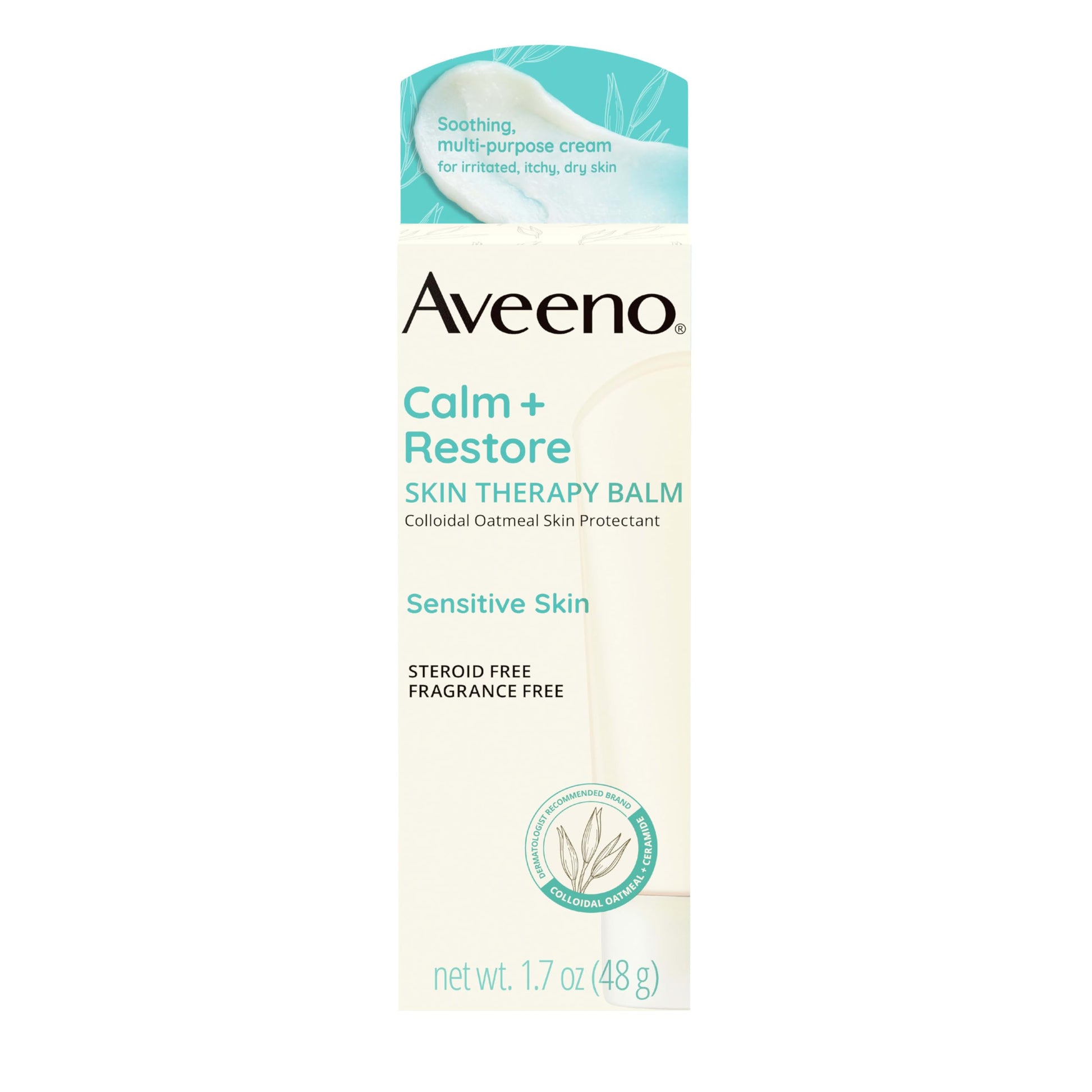 1.7-ounce Aveeno Calm + Restore Skin Therapy Balm with colloidal oatmeal & ceramide designed for sensitive skin with nourishing oat goes beyond soothing & restores skin's moisture barrier & reveals healthy-looking skin