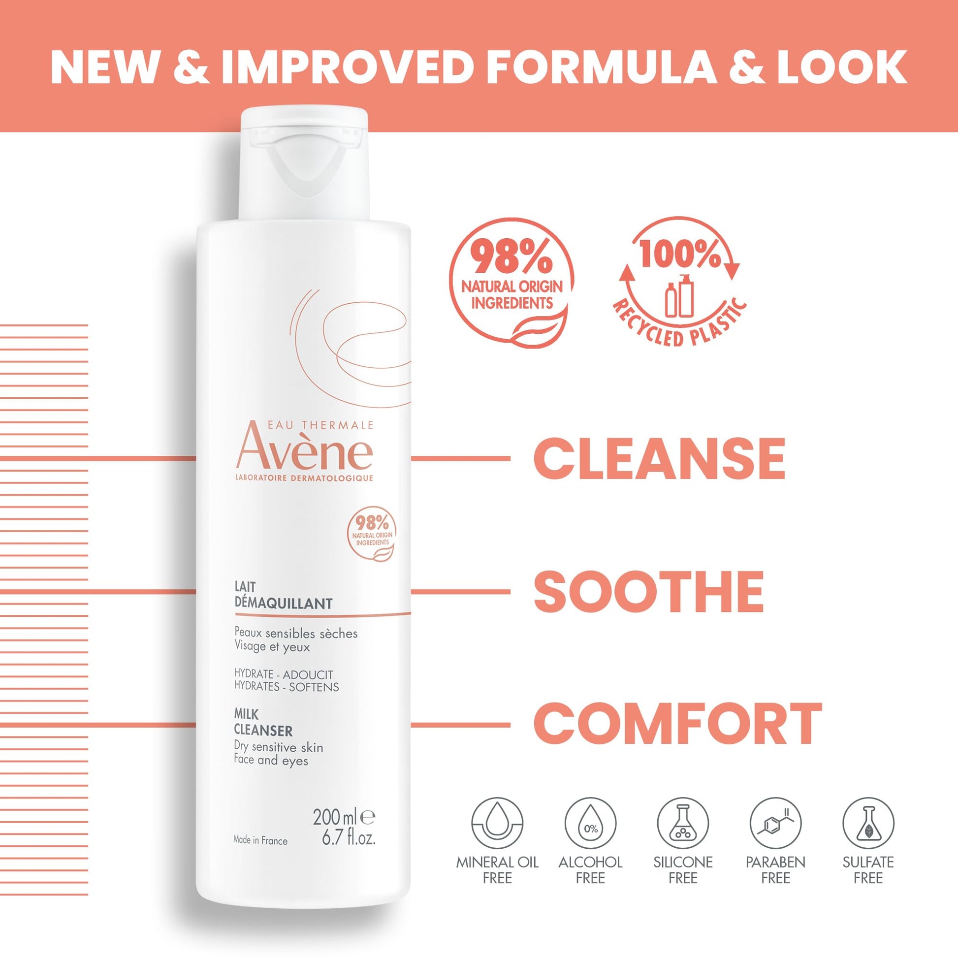 Details: A non-greasy, no-rinse cleanser that hydrates and soothes dry to very dry, and sensitive skin while removing makeup, dirt and oil. Best for dry and sensitive skin types. The melting texture leaves skin feeling soft, smooth and supple without feeling greasy. Non-greasy and non-sticky, milky texture. 98% natural formula is free from undesirable ingredients and is tested under dermatological and ophthalmological control, and on sensitive skin. Avene's range of cleansers allow all skin types including sensitive skin access to a facial cleansing routine that offers dermatologial efficacy, tolerance and naturalness. High concentration of Avène Thermal Spring Water soothes and preserves the skin’s natural balance. Improves skin hydration by +70% from 30 min with Glycerin hydrating agent, and skin remains hydrated for up to 6 hours. 100% recycled and recyclable plastic components (excluding pump). Formulated without soap, mineral oil, alcohol, silicone, paraben, ethoxylated agents, aluminum, animal origin ingredient, wheat, talc and sulfate.