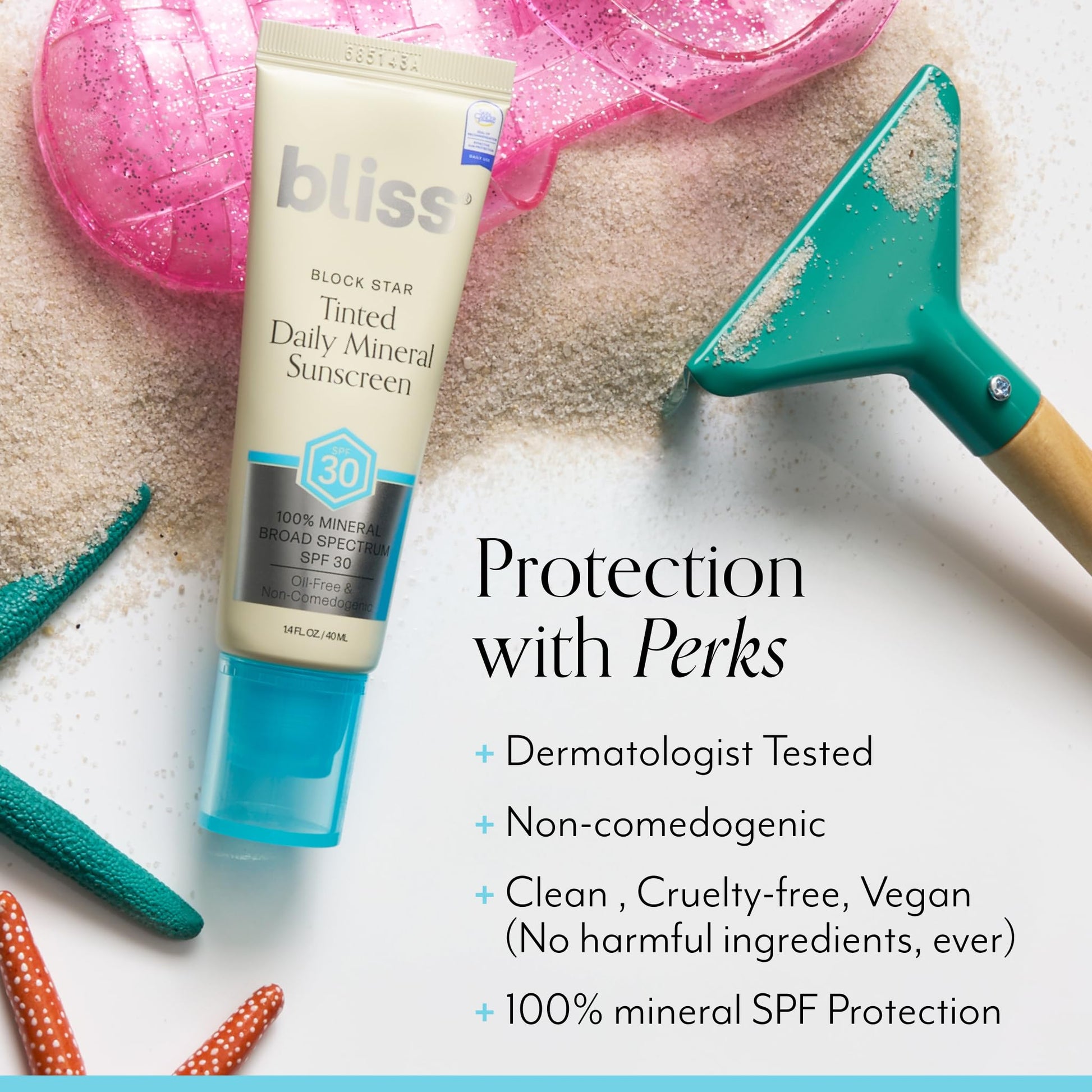 Bliss Block Star SPF 30 Daily Tinted Mineral Sunscreen with Zinc Oxide - All Skin Tones - 100% Mineral Broad Spectrum Sunscreen with Titanium Dioxide & Antioxidant Blend- 1.4 fl oz.