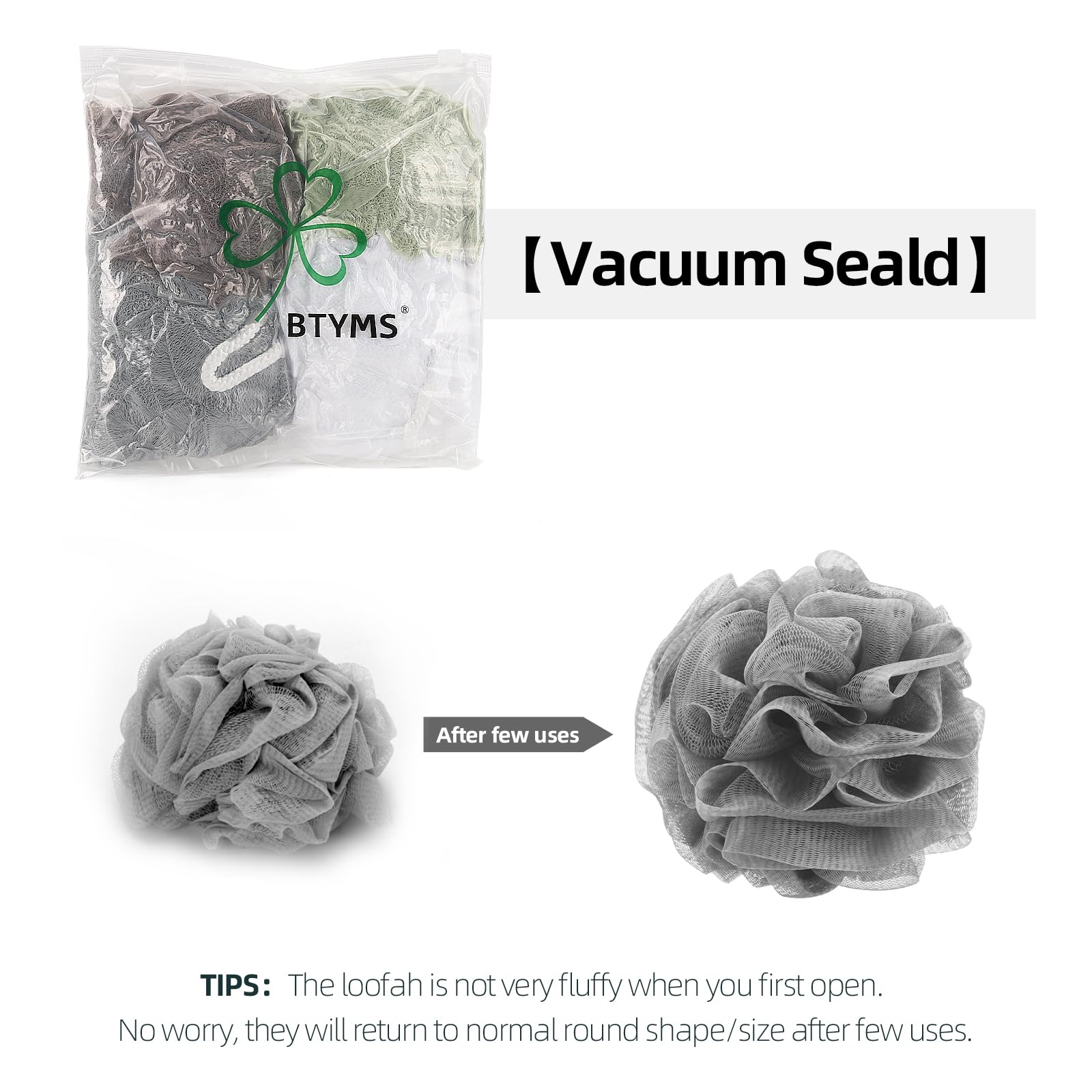 • Vacuum Seald: The loofah is not very fluffy when you first open. No worry, they will back up to normal round shape/size after few uses