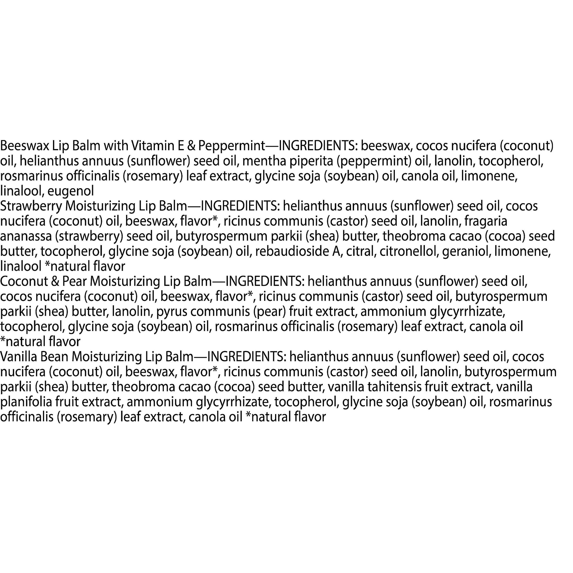 FOUR REFRESHING FLAVORS: Delight the senses with Beeswax, Strawberry, Coconut and Pear, and Vanilla Bean flavors that will encourage you to apply flavored lip balm over and over again
