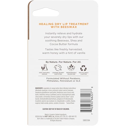 Details: Burt's Bees Honey Vanilla Rescue Lip Relief Lip Balm instantly hydrates and replenishes extremely dry lips. Formulated with responsibly sourced beeswax, shea butter and cocoa butter, this lip moisturizer immediately relieves dryness and helps protect lips' natural moisture barrier. The lightweight, non-sticky beeswax formula is easy to wear, and it features the delicious taste of freshly harvested warm honey with a hint of vanilla. Formulated without parabens, phthalates, petrolatum or SLS, this moisturizing lip balm is 100% natural origin to rejuvenate and beautify lips with clean ingredients. For relief of dry lips no matter where you are, just tuck a tube of this natural origin lip balm into your pockets or purse to keep nurturing lip care at your fingertips. Use Burt's Bees Lip Balm to make lips feel their best. Burts Bees is the No. 1 dermatologist-recommended natural skin care brand (1). (1) Based on a November 2023 NielsenIQ national survey of U.S. Dermatologists