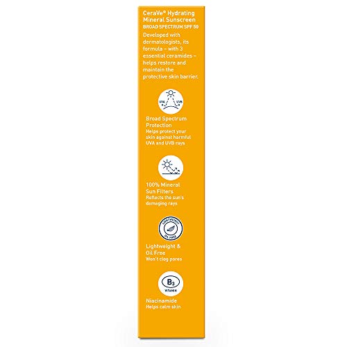 Details: "Developed with dermatologists, CeraVe Hydrating Sunscreen Face Lotion provides broad-spectrum protection with 100% mineral sunscreen that reflect the sun’s damaging UVA/UVB rays. This lightweight sunscreen formula provides all day hydration with three essential ceramides that help restore the skin’s natural barrier and lock in moisture long after. Allergy tested Fragrance-free Paraben-free Oil-free Non-comedogenic Suitable for sensitive skin Gentle on the skin Key Ingredients: 100% Mineral Sunscreen: Zinc oxide & Titanium dioxide sunscreen filters that reflects the sun’s rays. Does not contain oxybenzone or avobenzone. Ceramides: Essential for healthy skin, ceramides help restore and maintain the skin’s natural barrier Hyaluronic Acid Sunscreen: This ingredient attracts hydration to the skin’s surface and helps the skin retain moisture"