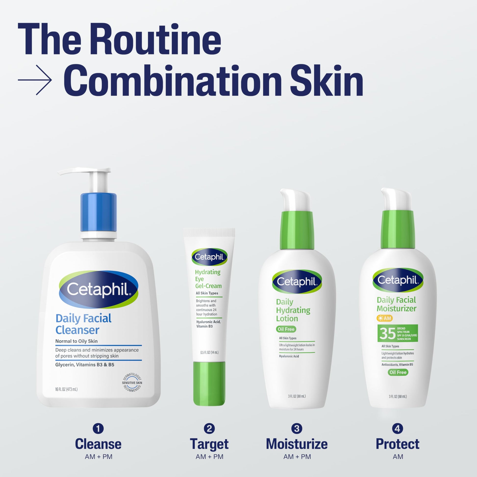 Details: Cetaphil Daily Oil Free Hydrating Lotion with hyaluronic acid provides immediate and intense 24 hour hydration for combination skin. This face lotion contains a combination of powerful moisturizing agents, including hyaluronic acid, to rehydrate the skin and lock in moisture for instant hydration. The lightweight, oil free formula is ideal for use under makeup and is non-comedogenic, providing long lasting hydration without clogging pores, making it suitable for acne prone skin, Hypoallergenic and fragrance free, this daily lotion is dermatologist tested and clinically proven to be gentle and non-irritating, even for the most sensitive skin.