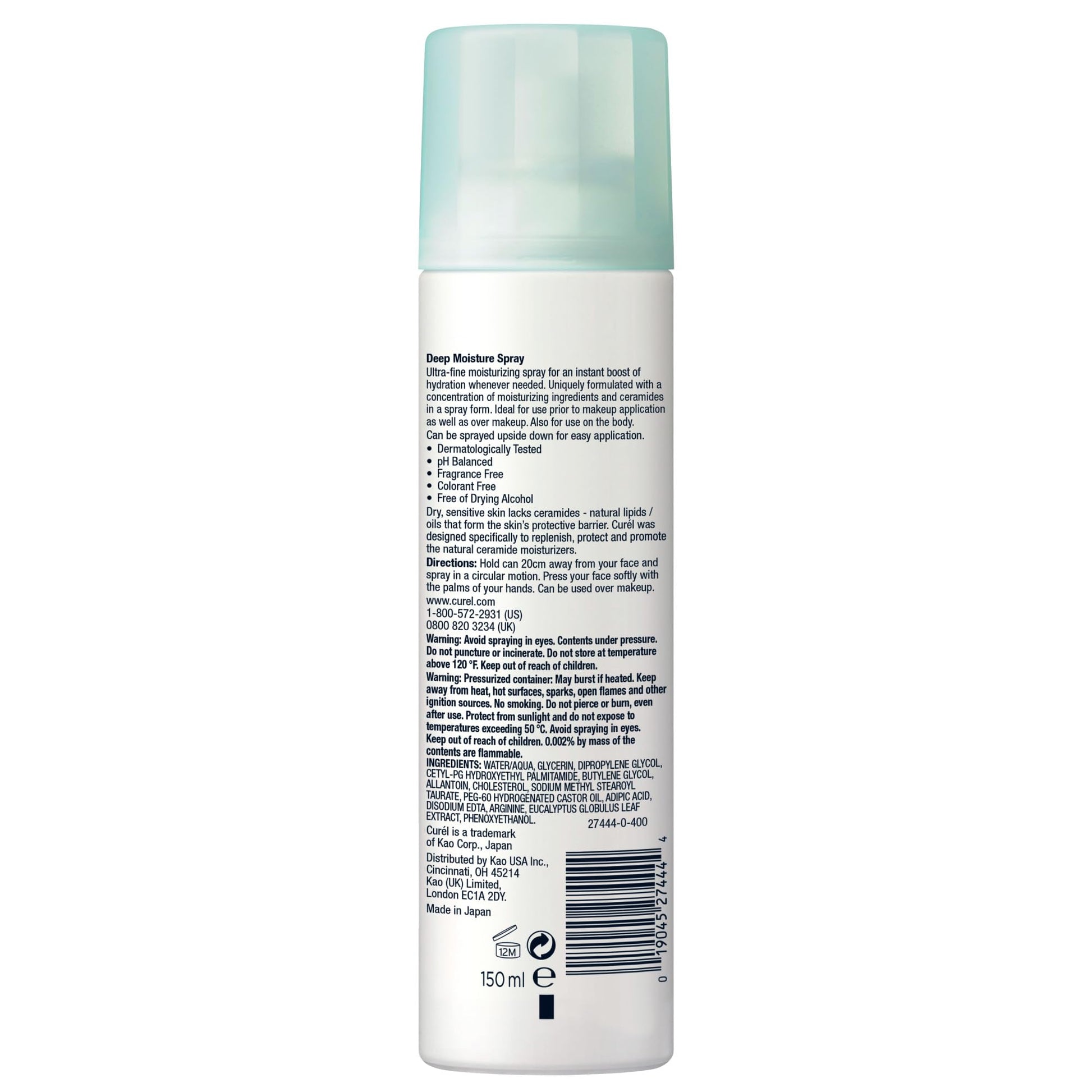 Details: Give your skin a natural, healthy glow with this ultra-fine moisturizing spray! Curel Japanese Skin Care Deep Moisture Spray is a moisture mist that adds an instant boost of hydration whenever you need it. Created by the skin care experts at Curel, this moisturizer spray was designed specifically to replenish, protect, and promote ceramides, natural lipids/oils that form a protective barrier against dryness. The Deep Moisture Spray is ceramide infused and is filled with concentrated moisturizing ingredients for a spray that delivers lasting hydration. Use this face mist hydrating spray before or after makeup for that extra burst of hydration. This facial spray can also be used on the body, a body moisturizing spray and body ceramide infused spray for all-over hydration and visibly healthy skin. This lightweight ceramide infused moisturizer is ideal for dry, sensitive skin, with a Dermatologist Tested, pH balanced, Fragrance Free formula. Colorant-free and free of drying alcohols, this spray on moisturizer delivers lasting dry skin relief. Satisfaction Guaranteed. Limitations may apply.