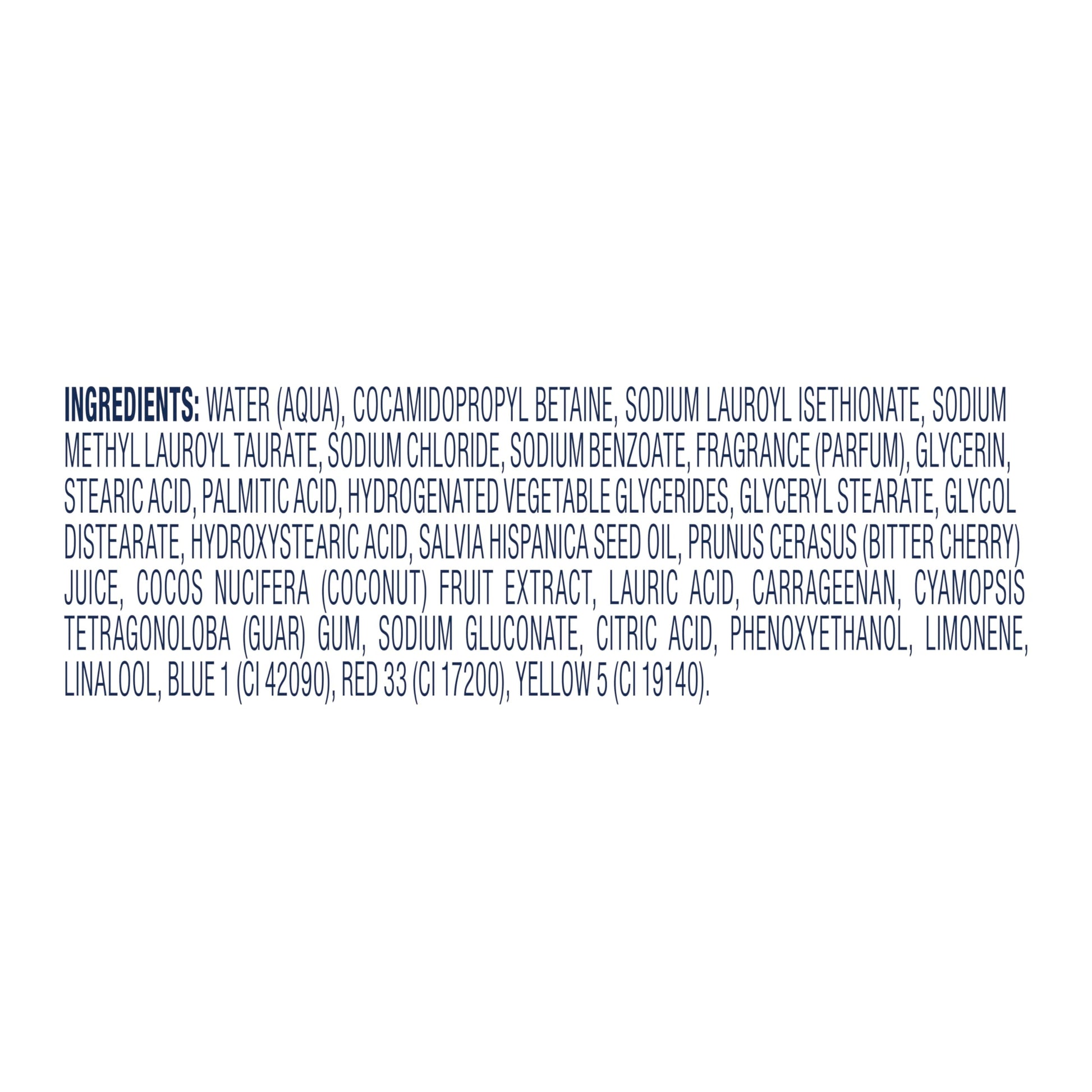 Details: Go ahead and treat yourself. Not us encouraging you to indulge in some sumptuous skincare every day. But while we’re at it, meet our Dove Revitalizing Cherry & Chia Milk Body Wash. This light gel formula will take your shower routine to a new level and deliver cleansed, nourished, revitalized skin. And the cherry on top? It’ll stay that way all day thanks to millions of 24hr Renewing MicroMoisture droplets, skin-natural nourishers and skin-loving plant-based moisturizers that are specifically designed to absorb deeply and work with your skin’s natural renewal process to help retain and boost moisture. Revitalized, renewed, and ready for more. Bonus (literal) cherry on top: Indulge your senses with this luscious wild cherry scent bursting with red fruits and creamy warm chia that makes this an addictive addition to your shower routine. To use this light gel formula, squeeze into palms or loofah, massage into skin, take it all in, let the lather soak in, rinse and step out of shower feeling revitalized and silky-smooth all over. Who else would you trust, but the dermatologist-recommended brand (us!) to deliver a long-lasting, hydrating body wash? Our Revitalizing Cherry & Chia Milk Body Wash is vegan and Dove is PETA approved, meaning we do not test on animals anywhere in the world. Plus, it’s sulfate-free, paraben-free, and packaged in 100% recycled bottles.
