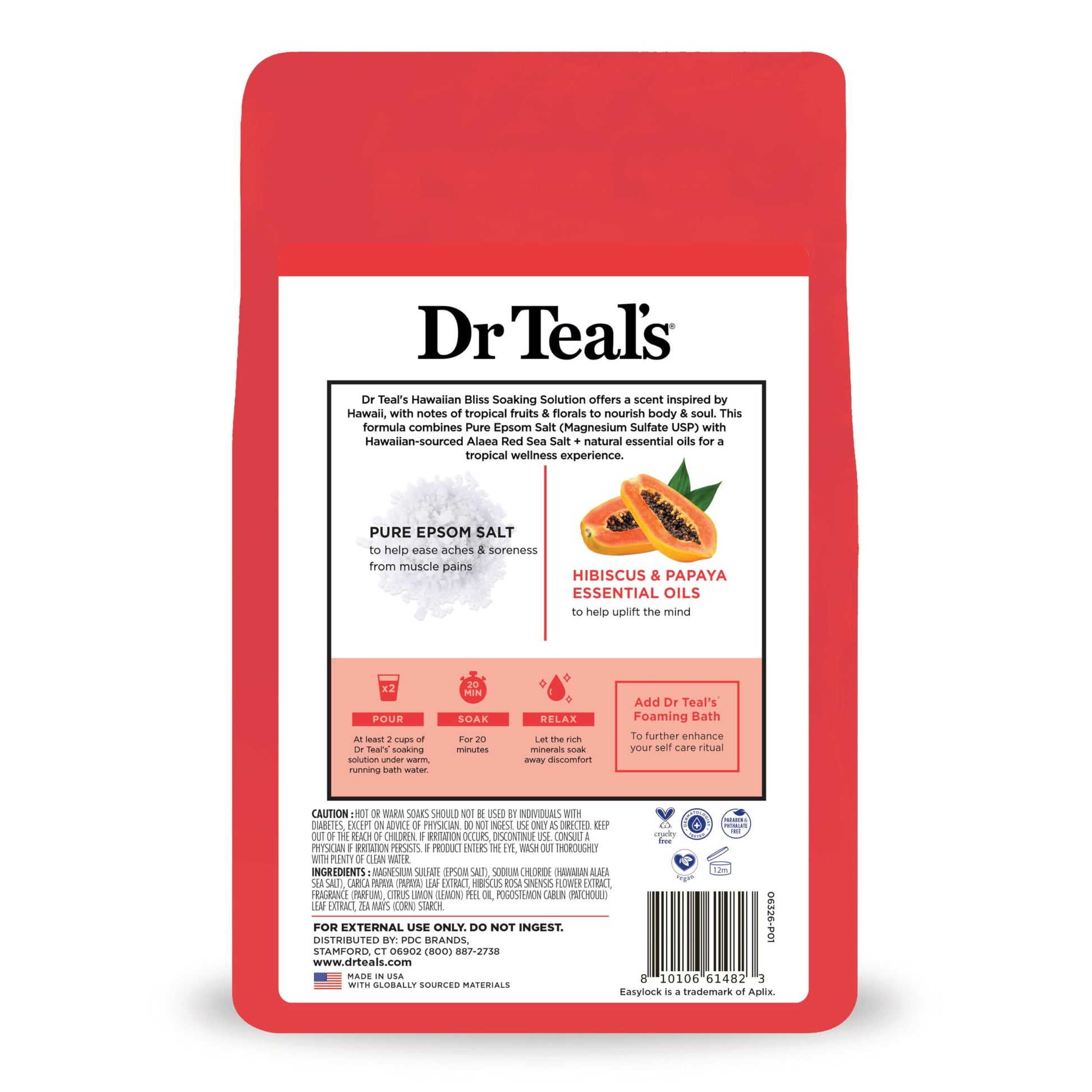 Details: New Limited Edition! Dr Teal’s Hawaiian Bliss Epsom Salt Magnesium Soak is made with ingredients from Hawaii to transform your bath into a tropical escape. Pure Epsom Salt (Magnesium Sulfate) relieves aches and soreness from muscle pain after a long day. Alaea Red Sea Salt from Hawaii, hibiscus and papaya essential oils uplift the mind for a tropical wellness experience. For an elevated experience, pair it with Dr Teal’s Hawaiian Bliss Foaming Bath. Dr Teal's Hawaiian Bliss Epsom Salt Magnesium Soak is dermatologist tested, paraben-free, phthalate-free, cruelty-free, and vegan.