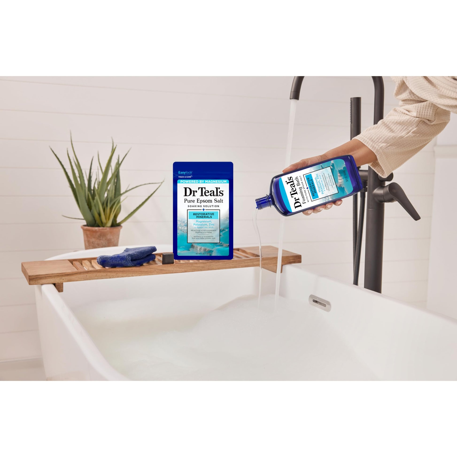 Details: Dr Teal’s Restorative Minerals Soak is inspired by the power of natural hot springs & geothermal nutrients with a beneficial blend of Magnesium, Potassium, Zinc, and Essential Oils. Featuring our signature Pure Epsom Salt (Magnesium Sulfate), this soak is perfect for relieving aches and soreness from muscle pain after a long day. Magnesium, potassium and zinc will help keep your skin revitalized and healthy, and the essential oil blend will help rejuvenate both your mind and body. Unwind from your day and experience a relaxing bath like no other so you can feel your best tomorrow. To elevate your experience, pair with Dr Teal’s Restorative Minerals Foaming Bath. Dr Teal's Pure Epsom Salt Soak, Restorative Minerals with Magnesium, Potassium & Zinc is paraben-free, phthalate-free, cruelty-free, and vegan.
