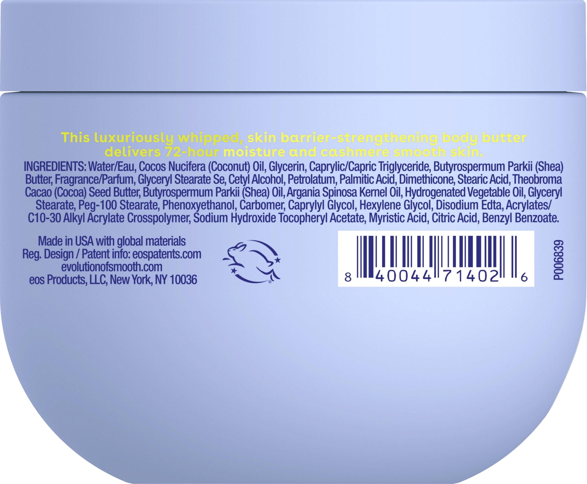 CASHMERE SMOOTH COMPLEX: eos Body Butter with naturally moisturizing & protective butters for cashmere smooth skin; cocoa butter deeply hydrates, while shea butter softens, and argan butter soothes & makes skin smooth