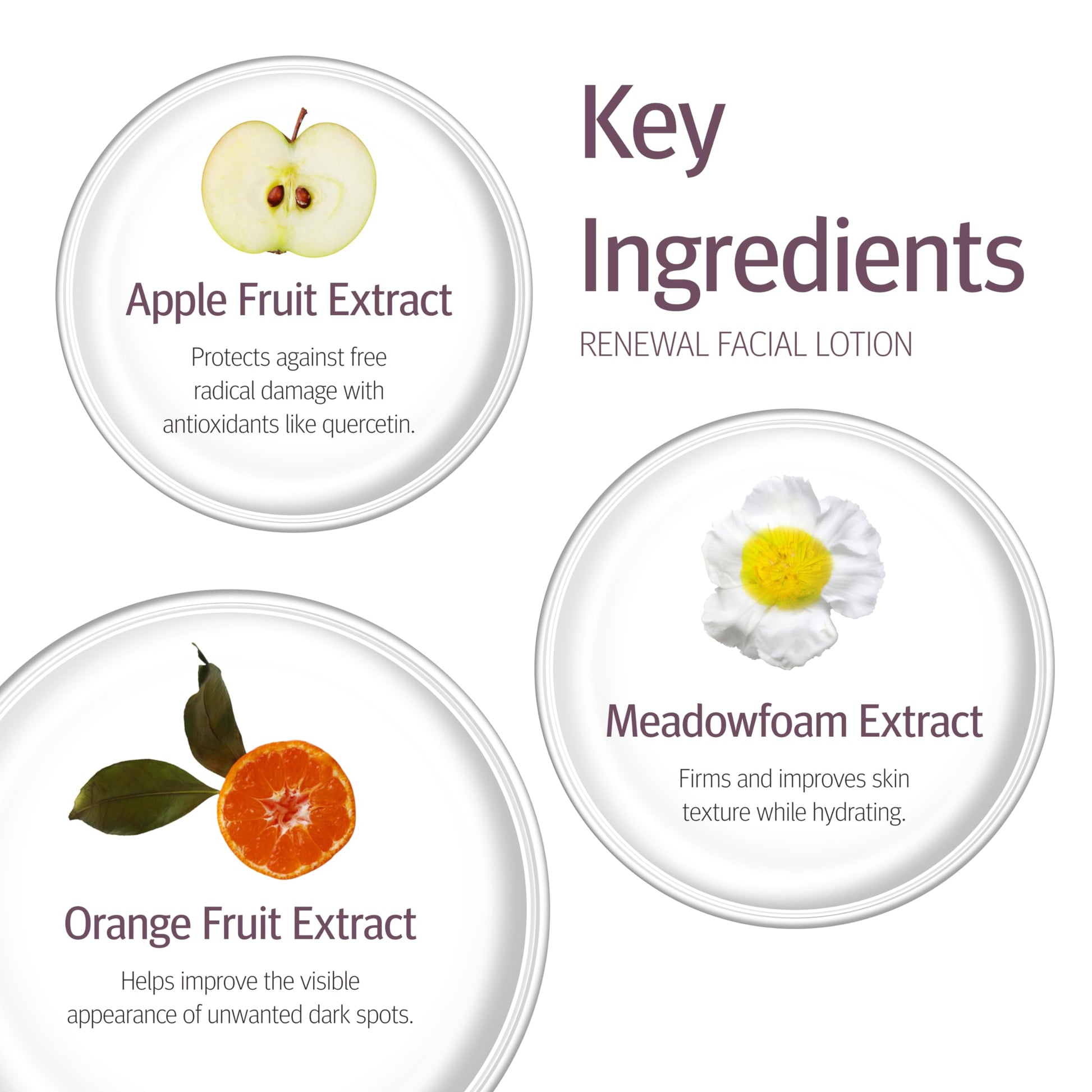 • Usage: The Renewal Facial Lotion is a hydrating lotion that reduces the appearance of fine lines and wrinkles. It contains the same active ingredients as Renewal Facial Cream but in a lighter formula.
