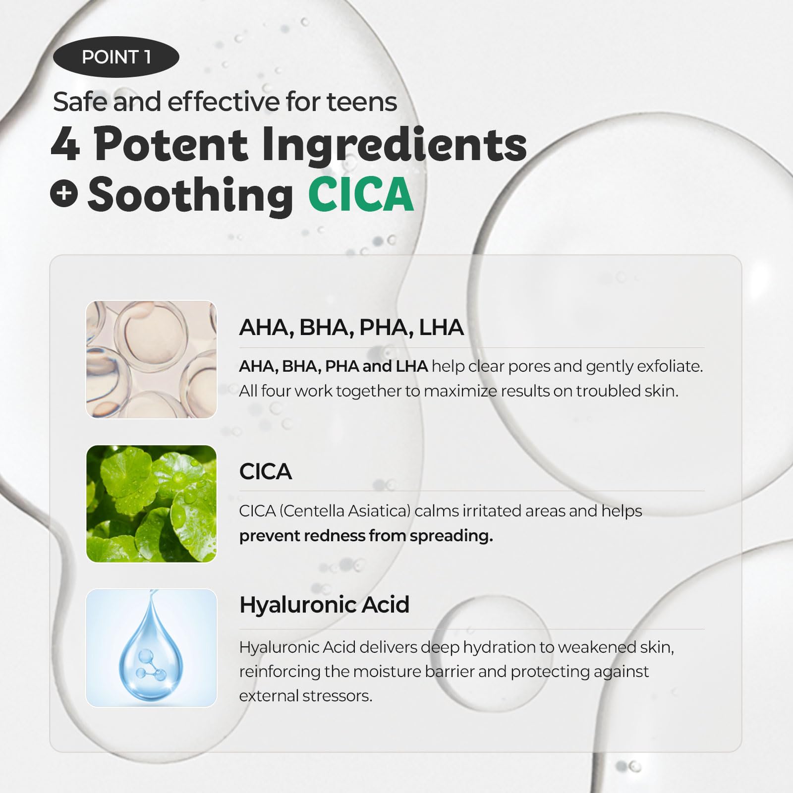 Blemish-Fighting Power with AHA + BHA + PHA + LHA Complex Exfoliates dead skin, clears pores, and helps regulate excess oil using four synergistic exfoliating acids. A potent pimple spot treatment that works without over-drying your skin.