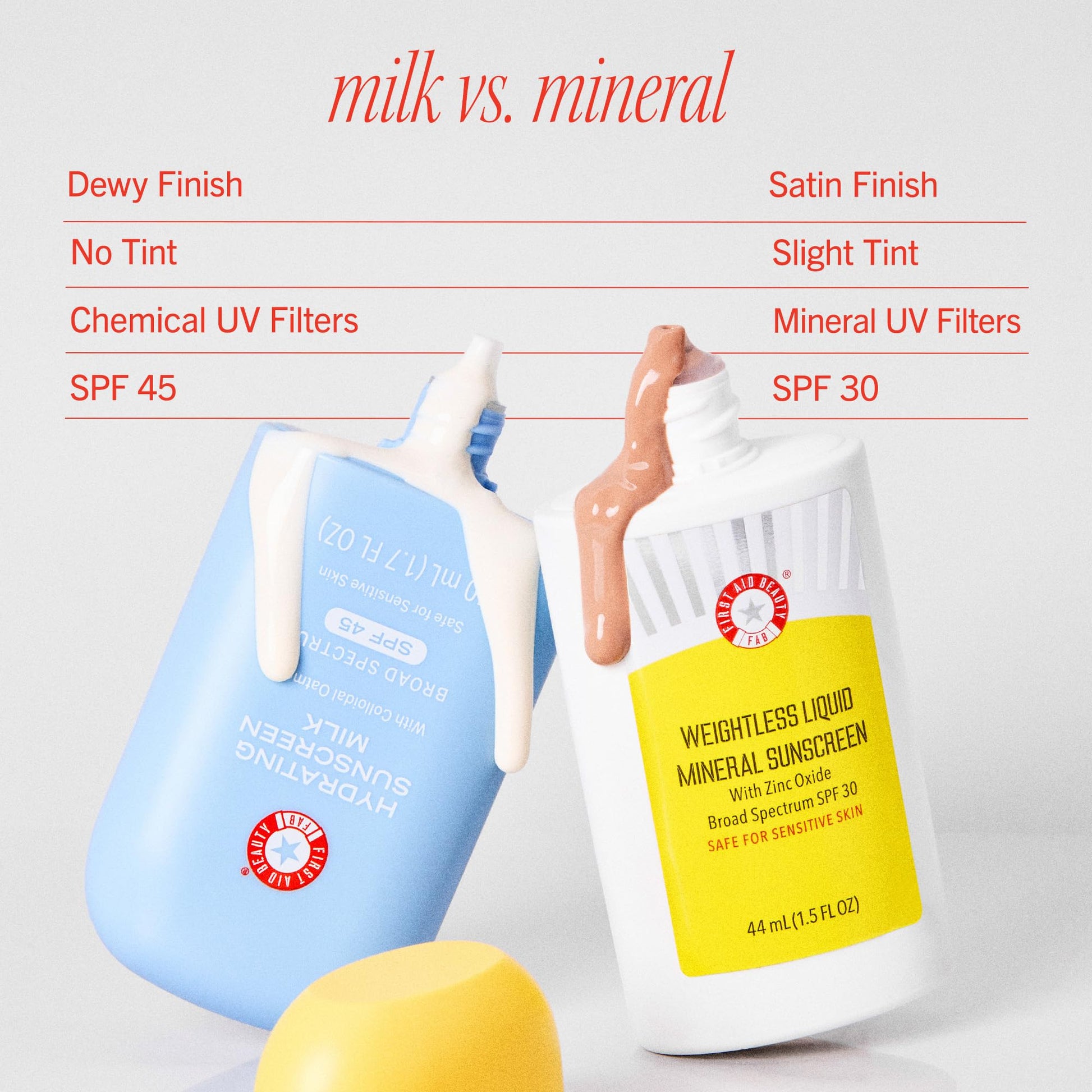 First Aid Beauty - Hydrating Sunscreen Milk with Colloidal Oatmeal, Broad Spectrum SPF 45, Non-comedogenic SPF Formula Helps Nourish Skin with Organic UV Filters & Glycerin, 24-hour Hydration, 1.7 oz