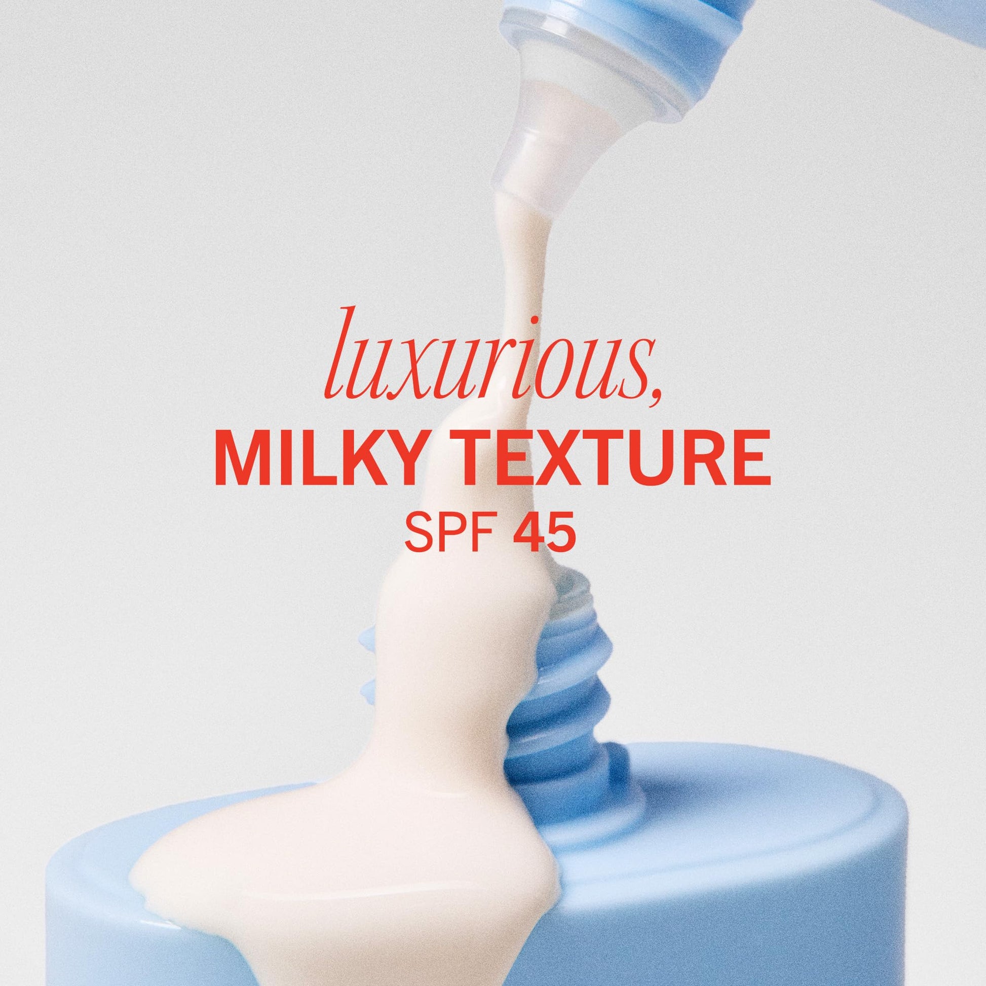 Lightweight, Seamless Protection: Hydrating Sunscreen Milk with SPF 45 offers a breathable, serum-like texture that blends into skin with no white cast, to provide high sun protection while keeping skin comfortable and refreshed all day.