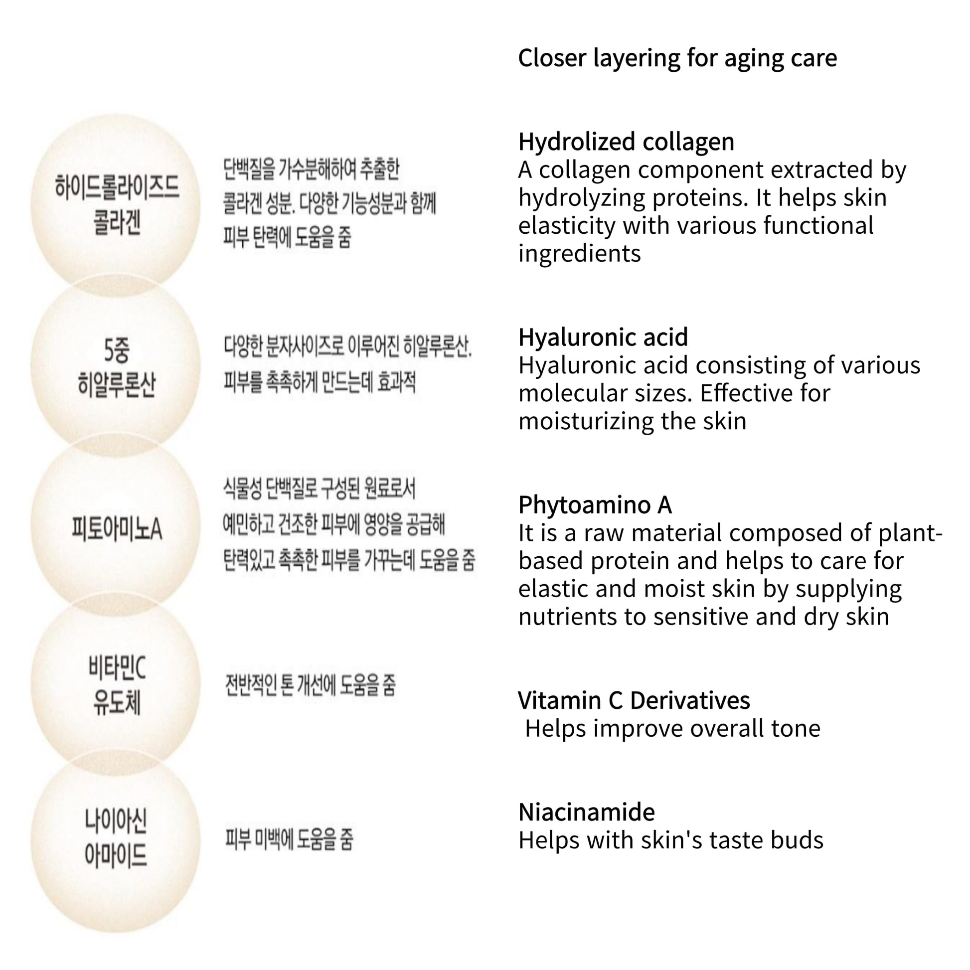 Hydrolized collagen: A collagen component extracted by hydrolyzing proteins. It helps skin elasticity with various functional ingredients