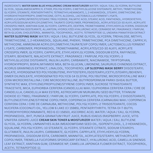 Highlighted Ingredients: Blue Hyaluronic Acid (Blue HA) (Water Bank Cream Moisturizer): Delivers effective, long-lasting hydration. Ceramide and Peptide Complex (Cream Skin Toner & Moisturizer): Intense, nurturing hydration and visibly firming benefits.