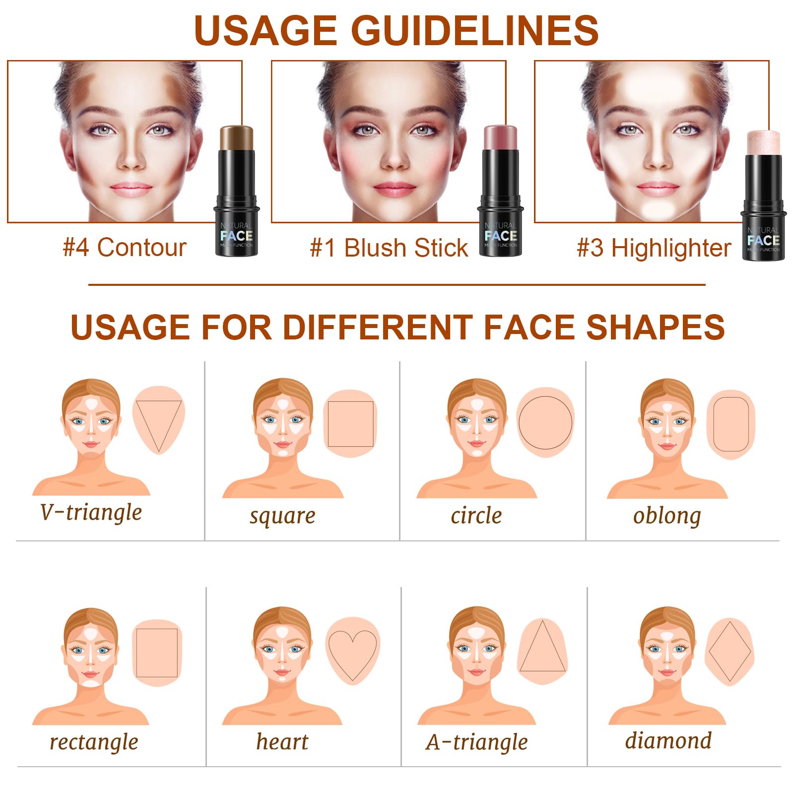 HOW TO USE : After applying your care foundation, use the highlighter stick, contouring stick and blush stick to gently apply to your forehead, cheeks, jawline and nose, then use a soft makeup brush to smooth out until it blends into your skin for a natural, perfect matte finish look.