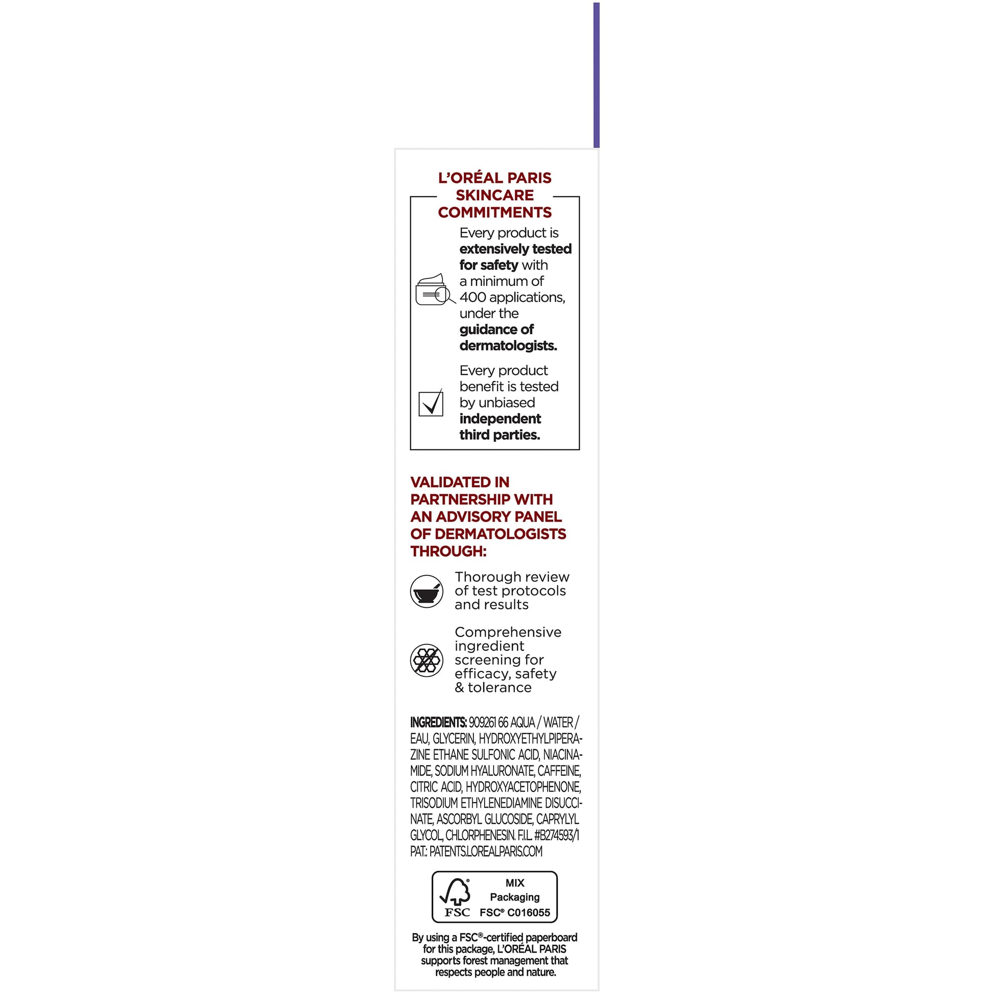 Details: New Revitalfit Derm Intensives eye serum for younger-looking eyes in just 2 weeks. New Revitalift Derm Intensives 2.5% [Pure Hyaluronic Acid plus Pure Caffeine] daily eye serum visibly replumps, brightens and reduces crow's feet wrinkles. Dermatologist-validated formula with optimal concentration of pure hyaluronic acid and pure caffeine is ophthalmologist tested for safety and contact lens suitable. How It Works: Daily eye serum with: - 1.5% Pure Hyaluronic acid, potent hydration-attracting molecule, naturally found in skin. Enhances skin's own moisture retention for lasting hydration and visibly replumped skin. - 1% Pure Caffeine, known to re-energize skin to help effectively reduce the appearance of dark circles and puffiness. Whats New: Apply the formula with our unique "Triple Roller" applicator with three cooling, stainless steel balls that bends providing a full eye contour massage to help noticeably depuff under eyes and leave eyes looking less tired.The Result: Immediately skin feels moisturized. In 2 weeks fine lines and crow's feet are visibly smoother. Eye area feels firmer and is visibly replumped. Eyes look younger, re-energized and less tired. Over time, dark circles look noticeably brighter. Effective for all skin tones. New L'Oreal Paris eye serum is Fragrance free, Allergy Tested, Paraben Free, Dye Free, Mineral Oil Free. Non-greasy. Dermatologist tested suitable for sensitive skin, Ophthalmologist-tested for safety.