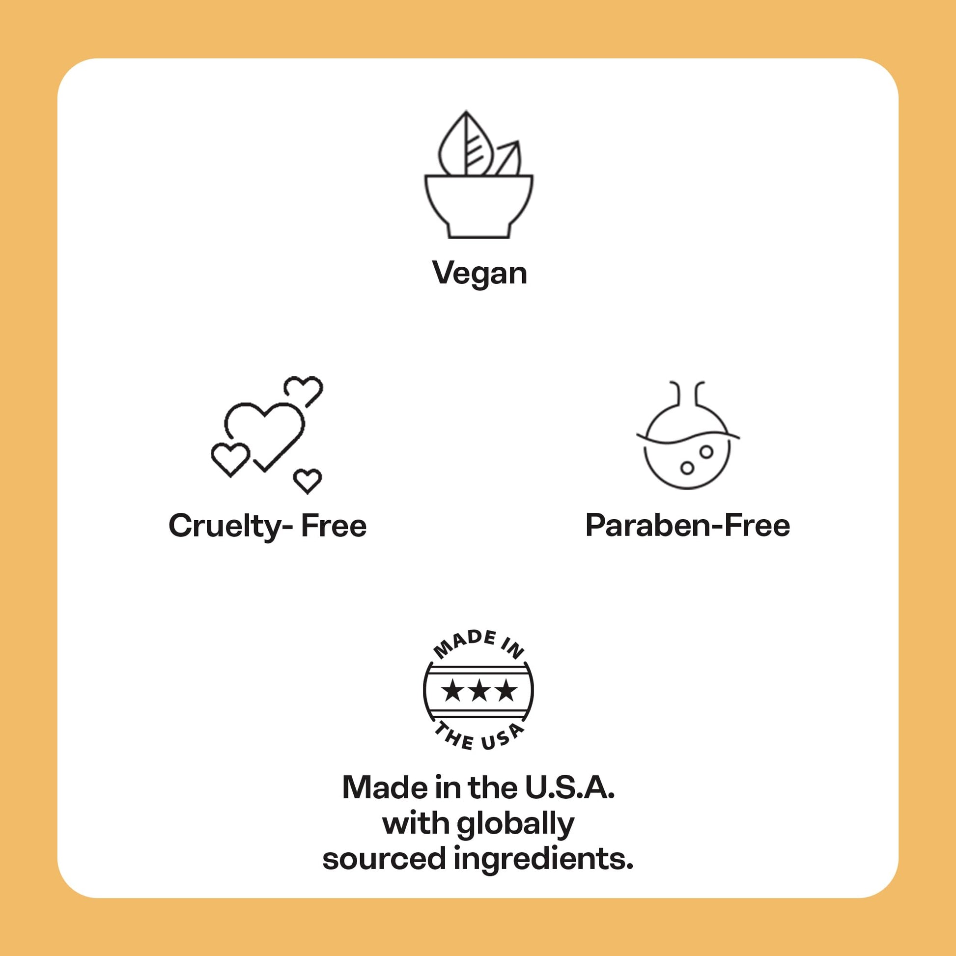 [FREE FROM] parabens, as well as, vegan, cruelty-free and made in the USA with globally sourced ingredients