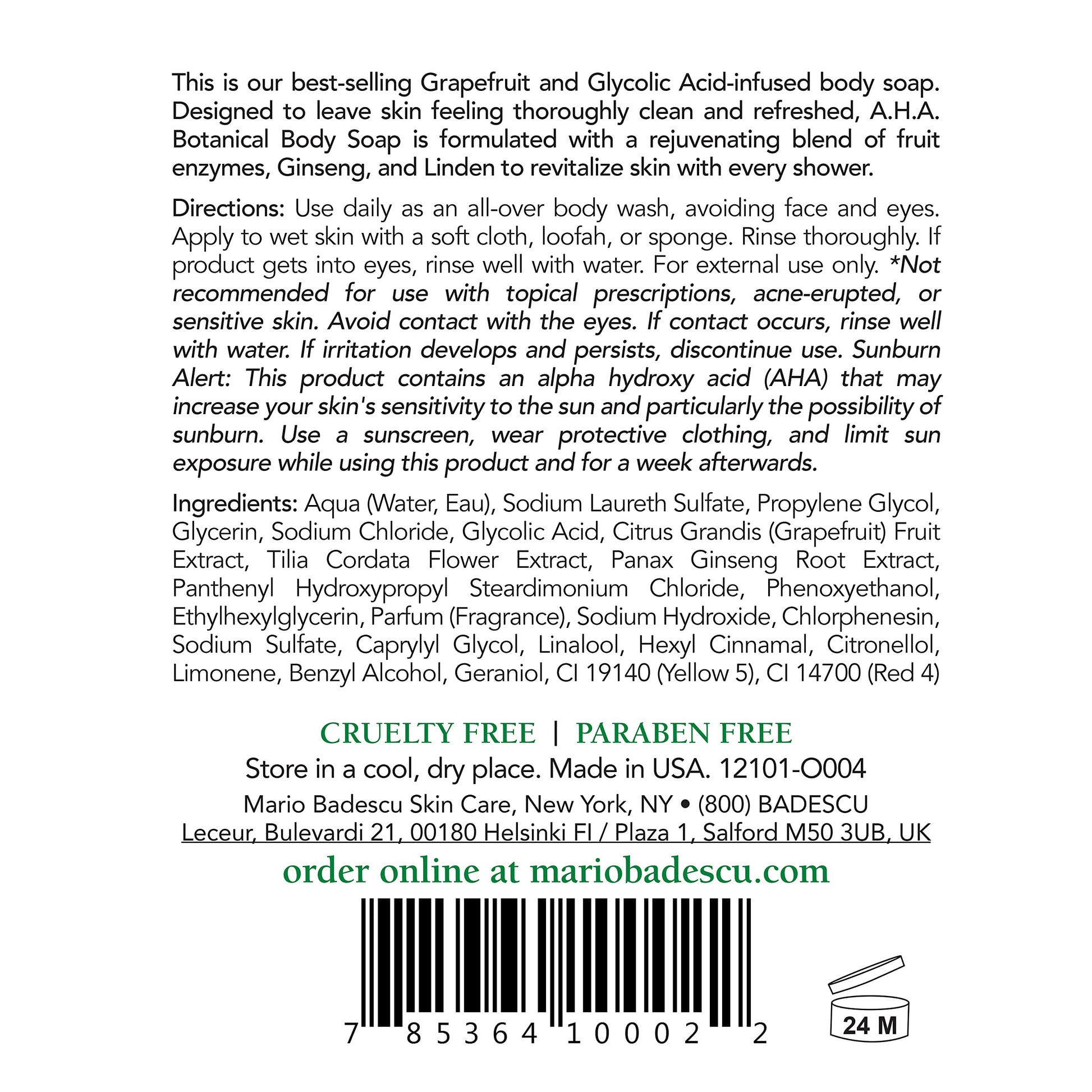 AHA Botanical Body Soap visually improves uneven skin tone and texture and refreshes skin for a fresh feel and luminous glow. Fruit enzymes, Ginseng, Grapefruit and Linden hydrate, brighten skin and provide a refreshing burst of scent and revitalization.