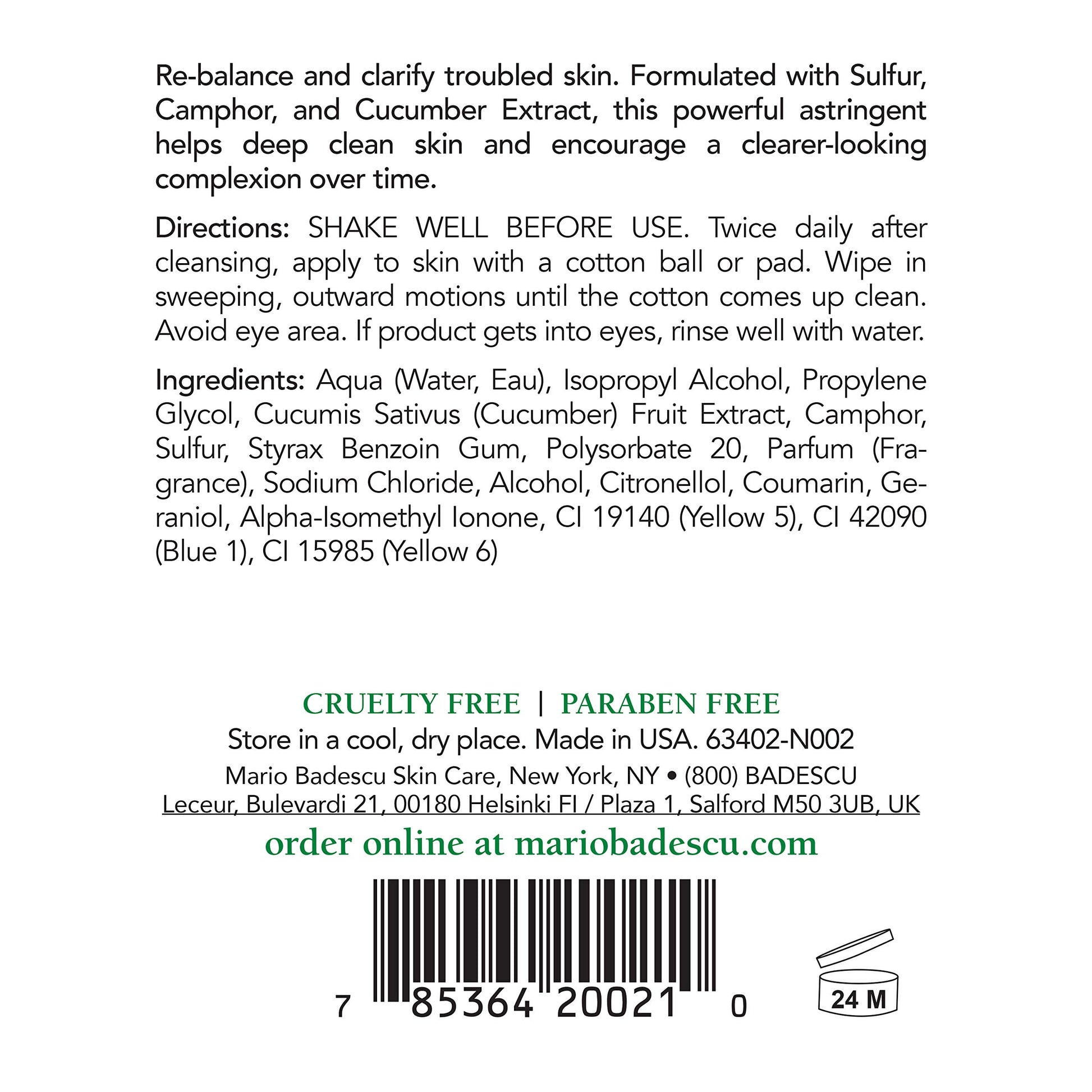 Details: Clarify and deeply cleanse problematic skin, clogged pores with this cooling and purifying lotion face toner for women & men. Specially formulated with Cucumber and Camphor to help cool, soothe, and calm skin. While Sulfur helps to clarify skin and draw out pore-clogging impurities.