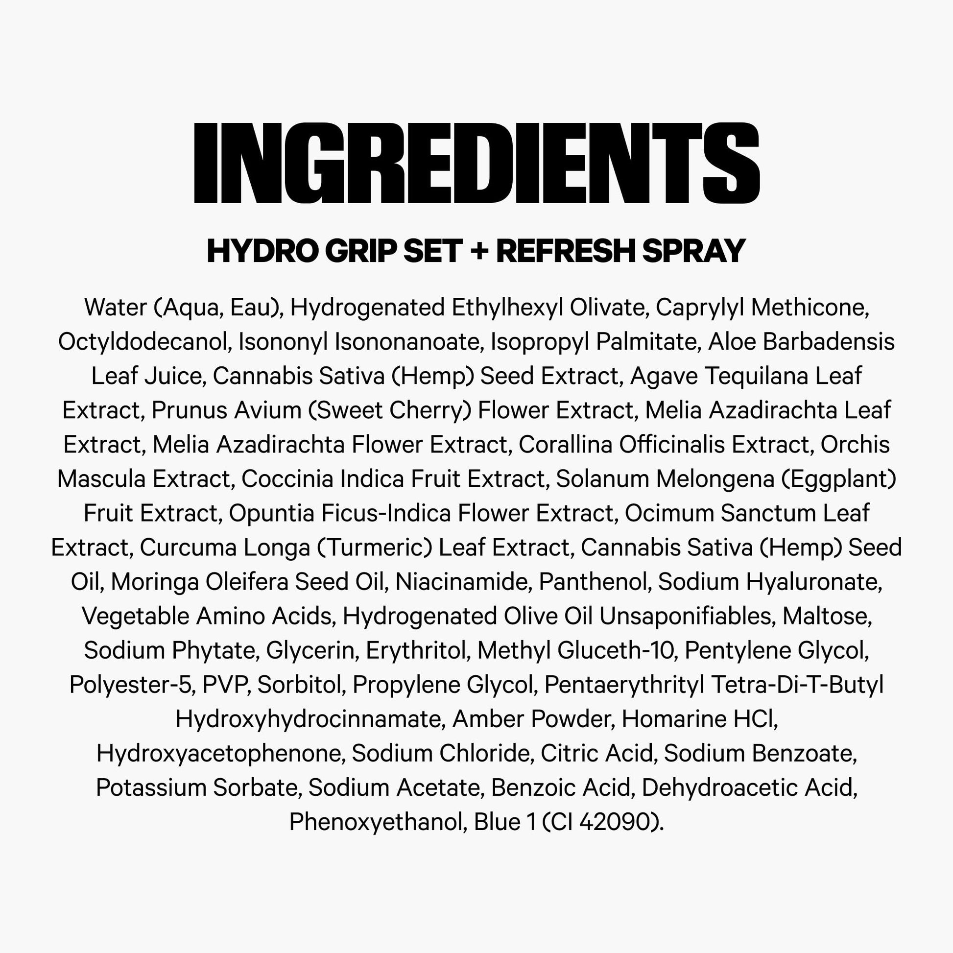 Details: Hydro Grip Set + Refresh Spray is clinically proven to keep your makeup fresh and in place for up to 12 hours. Suitable for all skin types and alcohol- + fragrance-free, this hydrating, non-sticky face mist is perfect for applying between layers of makeup to enhance wear time or applying throughout the day for a quick refresh as needed. Formulated with skincare-infused ingredients, this award-winning spray features Blue Agave Extract to grip makeup, Hyaluronic Acid + Niacinamide to boost hydration and Hemp Seed Oil to lock in moisture for a smooth, hydrated finish. To use, shake the bottle to mix and activate the formula, then close your mouth and eyes. Hold the bottle 8-10 inches away from your face and spritz twice to evenly distribute a fine mist. Reapply as needed throughout the day for a flawless finish. With Milk Makeup, it's high standards or nothing—that's why we don't use over 2,500 controversial ingredients. Everything is clean, vegan, cruelty-free, and made to make your life easier. Born out of Milk Studios, a creative hub in downtown New York City, community and self-expression are at the heart of everything we do. We believe it’s not about how you wear your makeup, it’s what you do in it that matters.