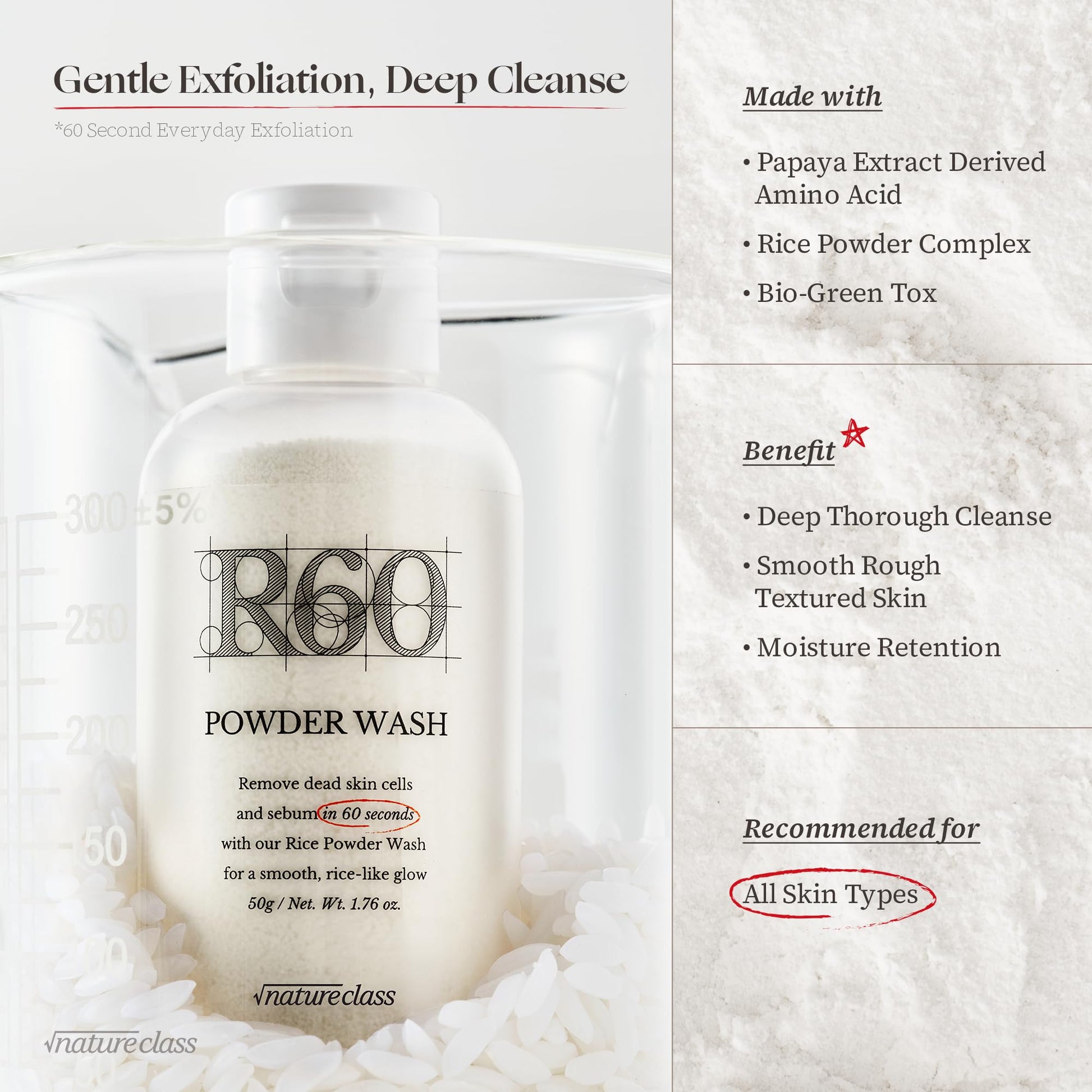 NATURECLASS R60 Rice Enzyme Powder Face Wash Cleanser – Exfoliating, Deep Cleansing, Removes Pore Impurities for Soft Radiant Skin, Korean Skincare1.76oz