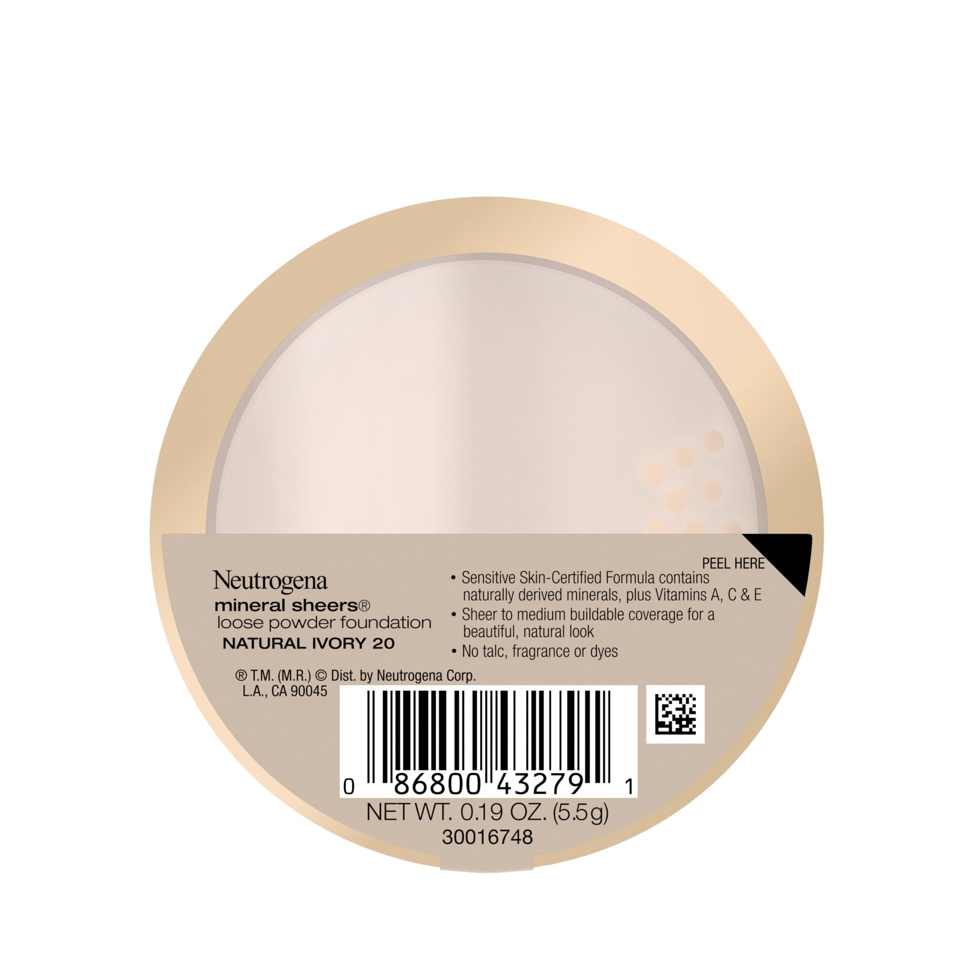 Neutrogena Mineral Sheers Loose Powder Makeup Foundation, Lightweight Face Makeup, Sheer to Medium Buildable Coverage, Sensitive Skin Foundation with Vitamins A, C, & E, Natural Ivory 20, .19 oz