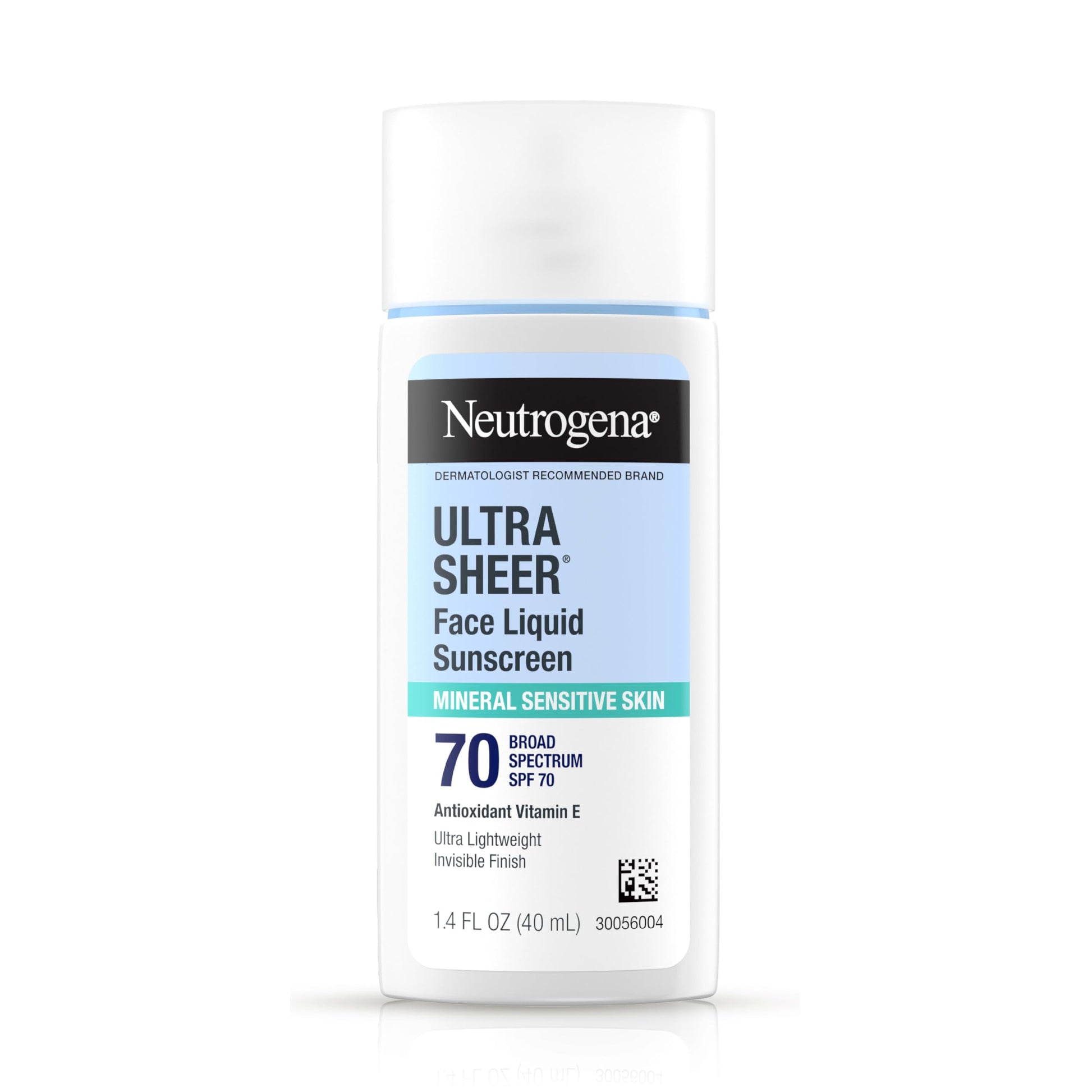 Details: Neutrogena Ultra Sheer Mineral Face Liquid Sunscreen offers SPF 70 broad spectrum UVA/UVB defense in a lightweight, liquid formula designed for sensitive skin and suitable for all skin types, including dry, oily, and combination. This facial sunscreen features Purescreen+ Technology with 100% mineral actives, combining zinc oxide and titanium dioxide for powerful sun protection that helps prevent sunburn and when used as directed with other sun protection measures, decreases the risk of skin cancer and early skin aging caused by the sun. The ultra lightweight liquid glides on smoothly, spreads easily, and dries quickly, delivering a silky, non-greasy, translucent finish that works well under makeup and is ideal as a face sunscreen for women and men seeking daily sun care. Hydration is maintained throughout the day, helping to reduce visual dryness for up to eight hours, while the fragrance-free, oxybenzone-free, paraben-free, and phthalate-free formula is hypoallergenic, non-comedogenic, and vegan, making it gentle for everyday use. This mineral face sunscreen is non-tinted and formulated with antioxidant vitamin E to support skin health. The convenient 1.4 fl oz tube is perfect for travel and on-the-go reapplication, ensuring your skin stays protected wherever you are. Incorporate this facial sunscreen into your daily skincare routine for seamless hydration, reliable sun defense, and a comfortable, non-greasy feel that leaves skin smooth and soft. As a trusted choice for those with sensitive skin, Neutrogena Ultra Sheer mineral face sunscreen is designed to meet the needs of anyone seeking high SPF, mineral-based sun protection. Apply generously and evenly 15 minutes before sun exposure and reapply every two hours for optimal protection throughout your day.