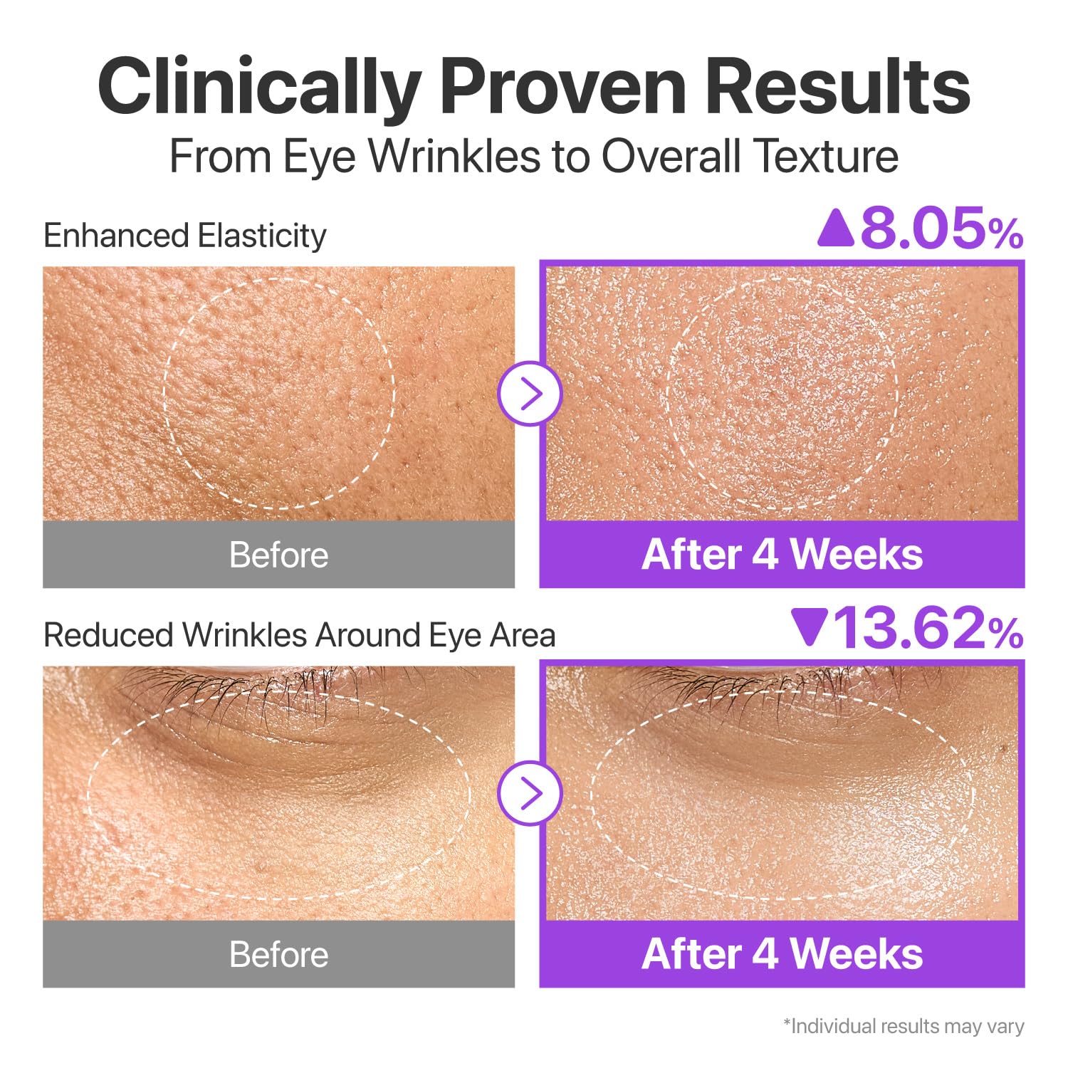 [CLINICALLY TESTED] Clinically proven to reduce 11 types of wrinkles (forehead lines, frown lines, crow’s feet, tear troughs, bunny lines, lip lines, smile lines, marionette lines, mouth frown, chin wrinkles, and neck lines) in just 4 weeks.