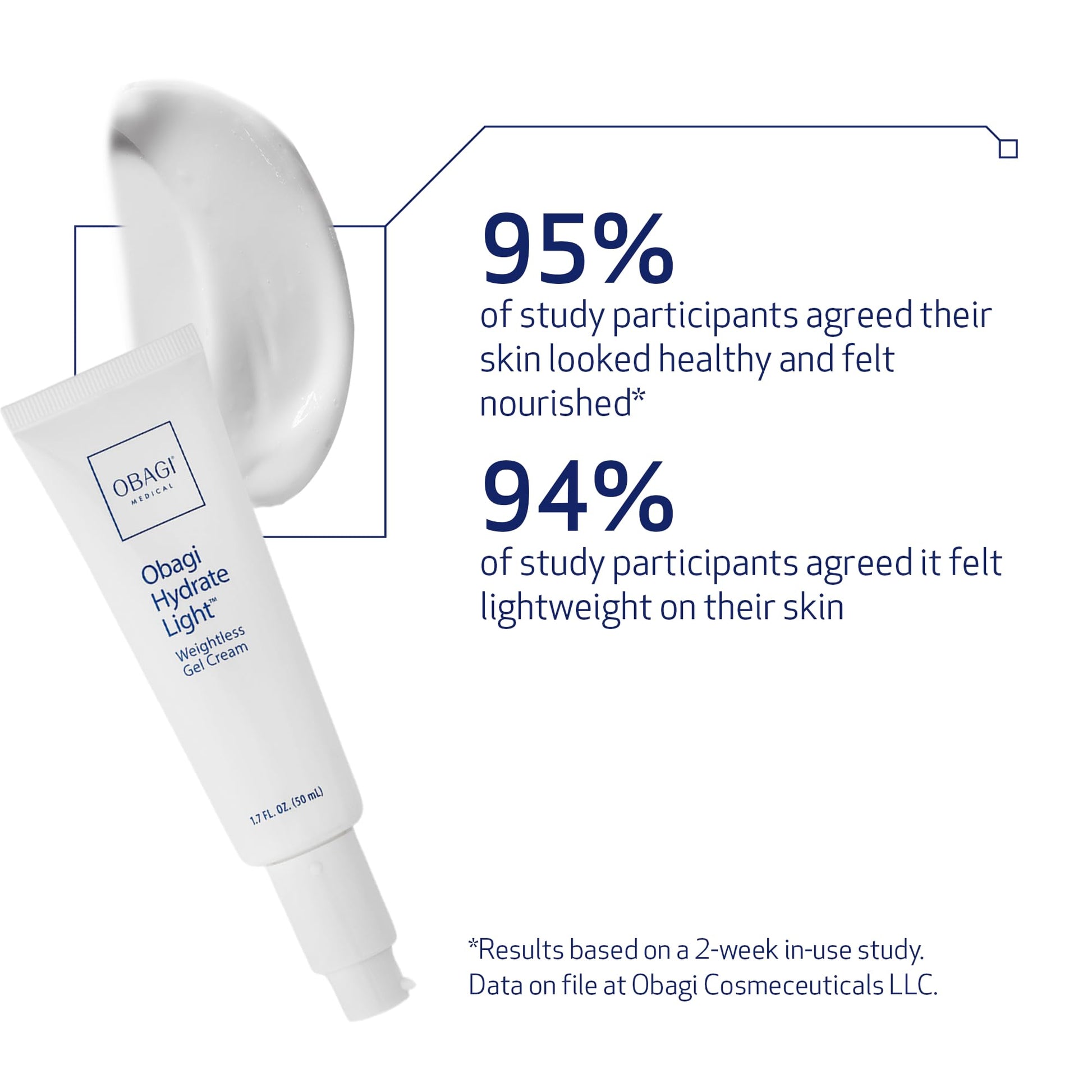 Clinically Proven: 94% of participants agreed Obagi Hydrate Light felt lightweight on their skin, and 95% of participants agreed their skin looked healthy and felt nourished in a 2023 in-use study; data on file at Obagi Cosmeceuticals LLC