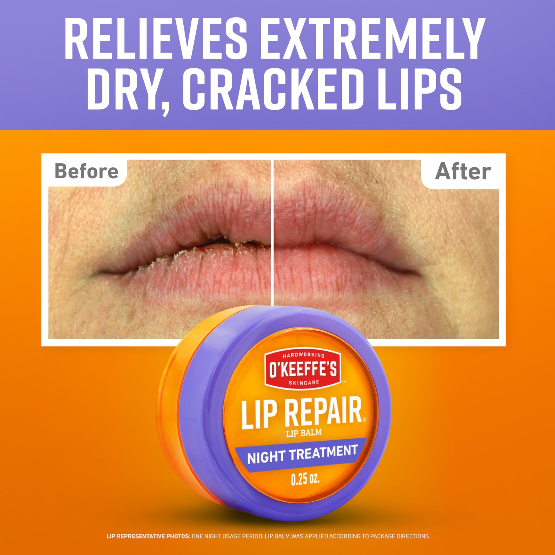 Details: Relief for Extremely Dry, Cracked Lips. O’Keeffe’s Lip Repair Night Treatment is an intense, restorative lip balm, to relieve & repair extremely dry, cracked lips while you sleep.