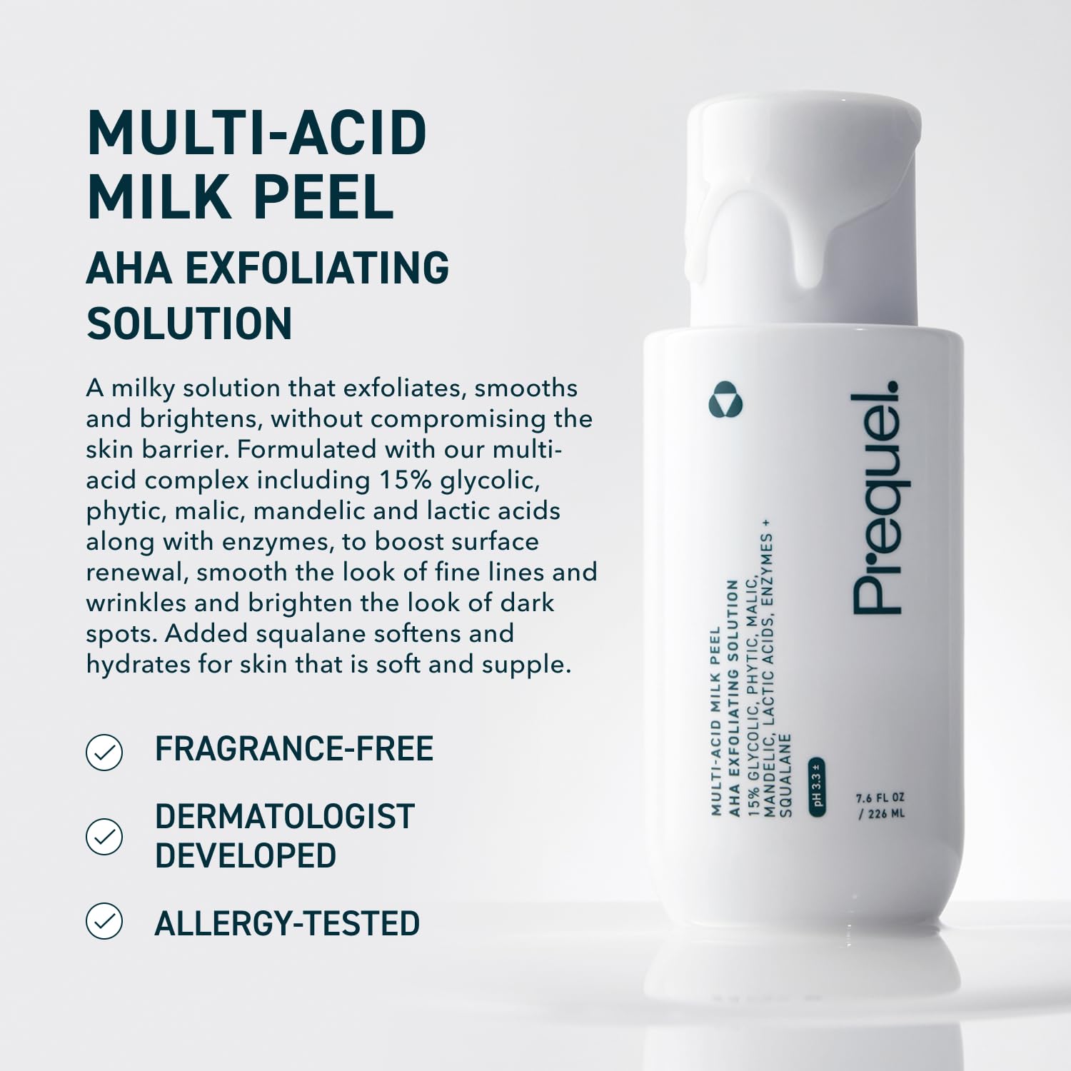HOW TO USE: Shake well, dispense a few drops into hands or cotton pad, and apply to face and neck. Do not rinse. Follow with Prequel serum and moisturizer. Start slowly with 1-2x per week to monitor skin sensitivity. Build up additional uses as tolerated. 7.6oz bottle. Prequel Skin, Dermatologist Developed, Clinically Tested, Proven Skincare