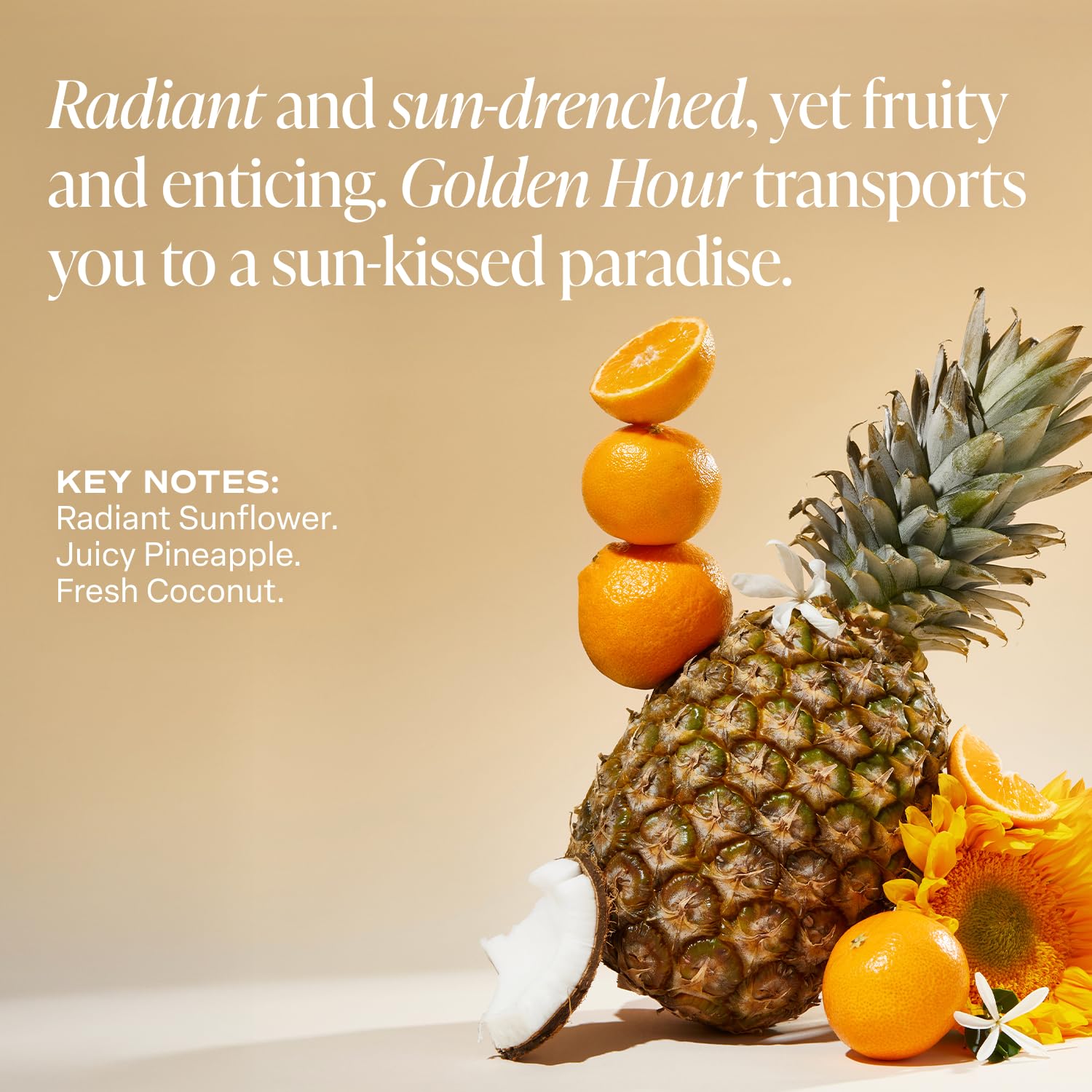 GOLDEN HOUR FRAGRANCE: Radiant Sunflower, Juicy Pineapple, and Fresh Coconut is a bright and uplifting tropical blend, bursting with sunny florals, luscious fruit, and creamy, beachy warmth. Sun-drenched and enticing, Golden Hour transports you to a sun-kissed paradise.