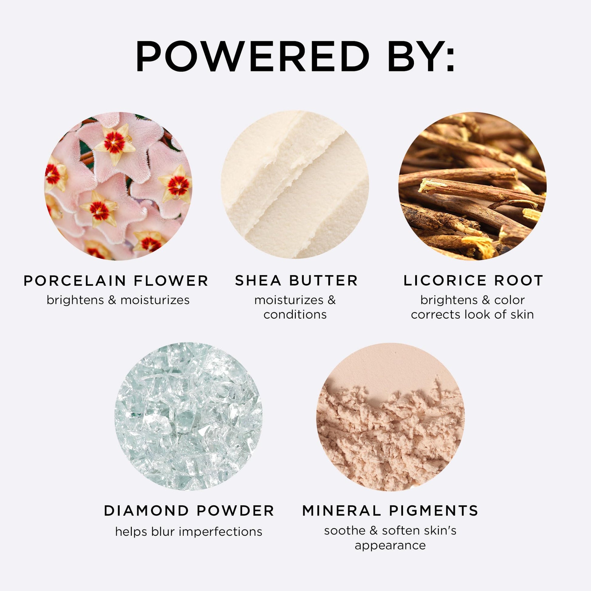 SKINVIGORATING INGREDIENTS: shea butter moisturizes & conditions; licorice root brightens & color corrects the look of skin; diamond powder helps blur imperfections; porcelain flower brightens & moisturizes; mineral pigments soothe & soften skin's appearance