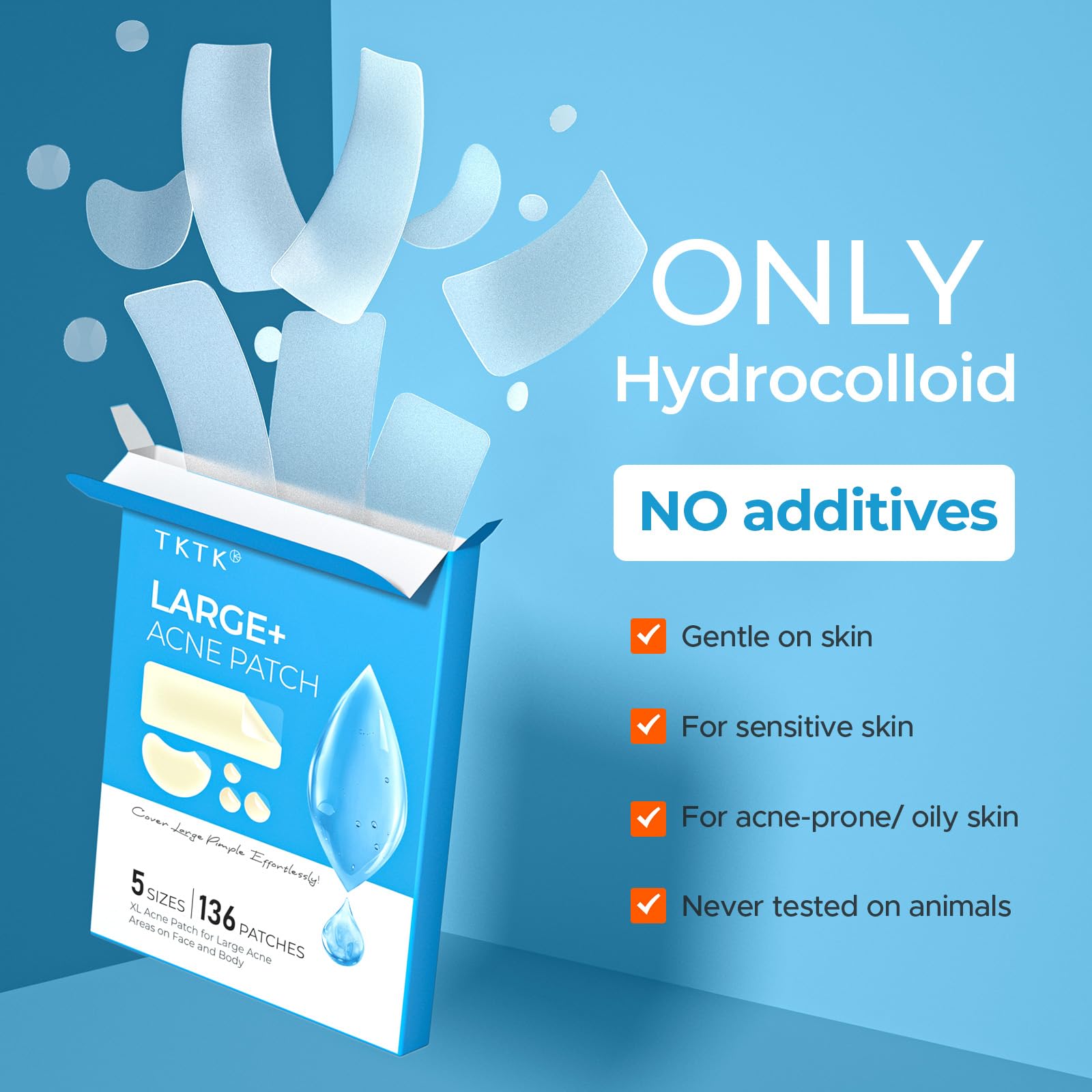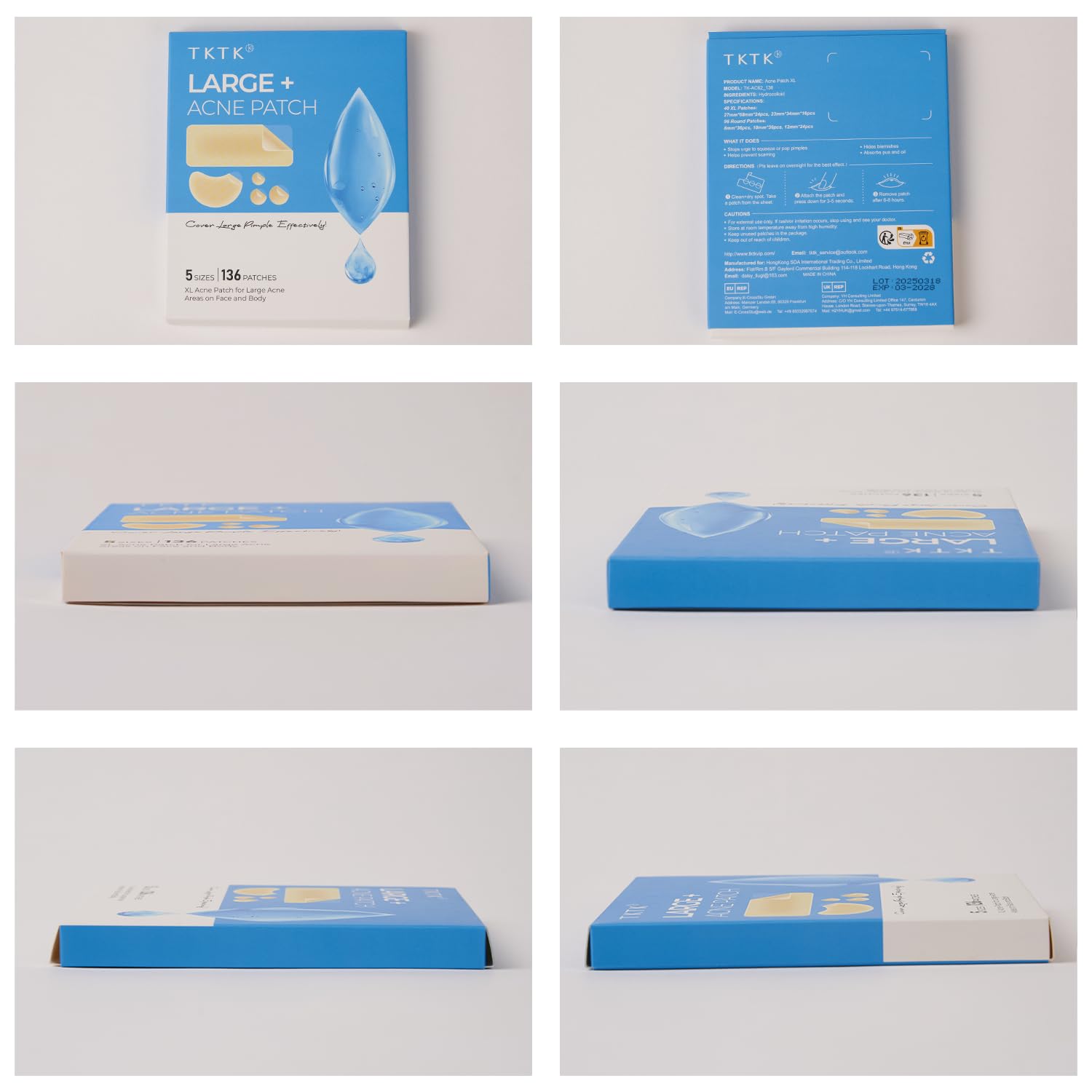 5 Sizes 136 Patches for Every Need: TKTK big acne patches offers 5 sizes ( 8mm, 10mm, 12mm, 68x27mm, 34*23mm) to tackle your acne concerns. Whether you have zit breakouts on your face, back, chest, nose or forehead, our large pimple patches effectively fit and address each area