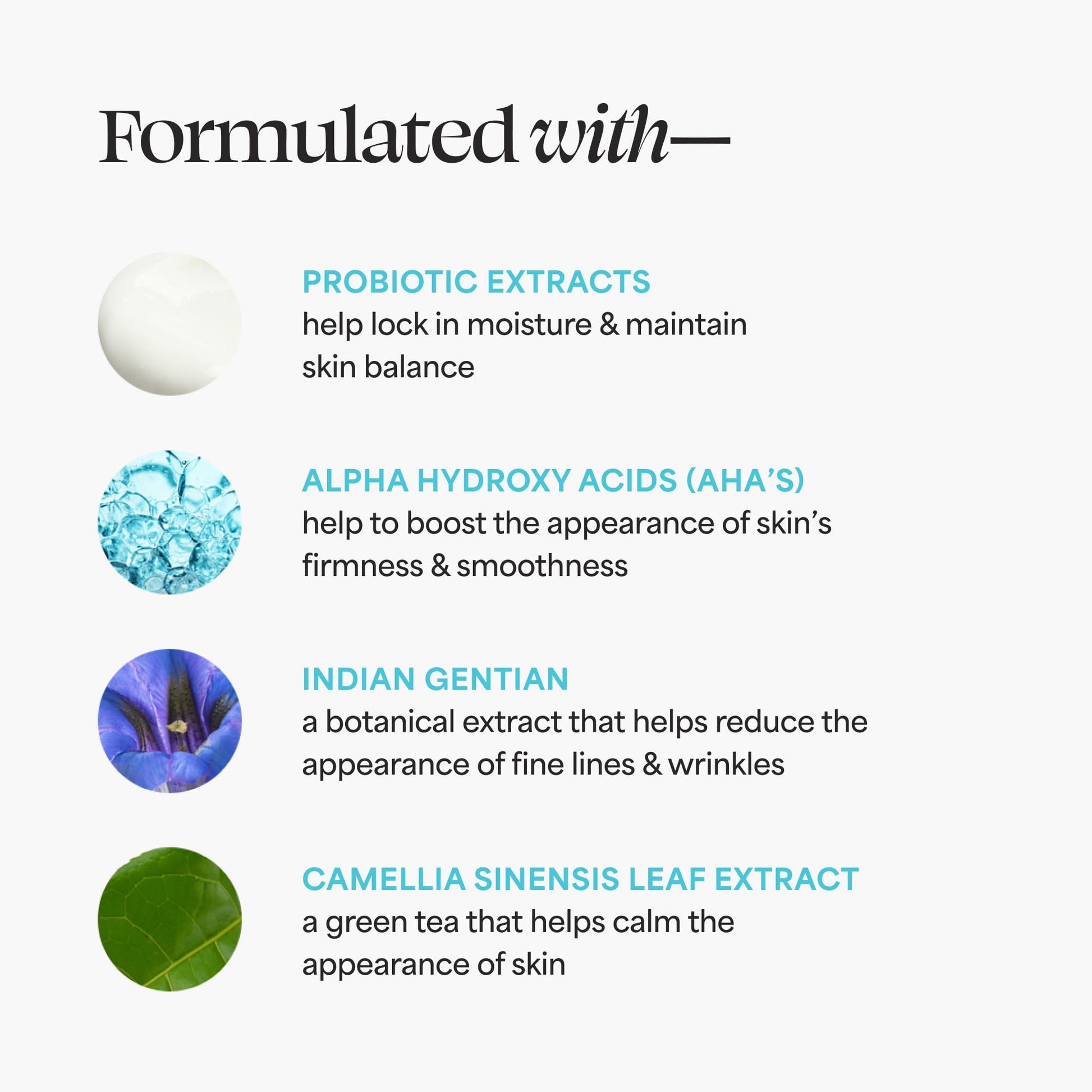 • Powered by probiotic extracts, AHA’s & Vitamin C