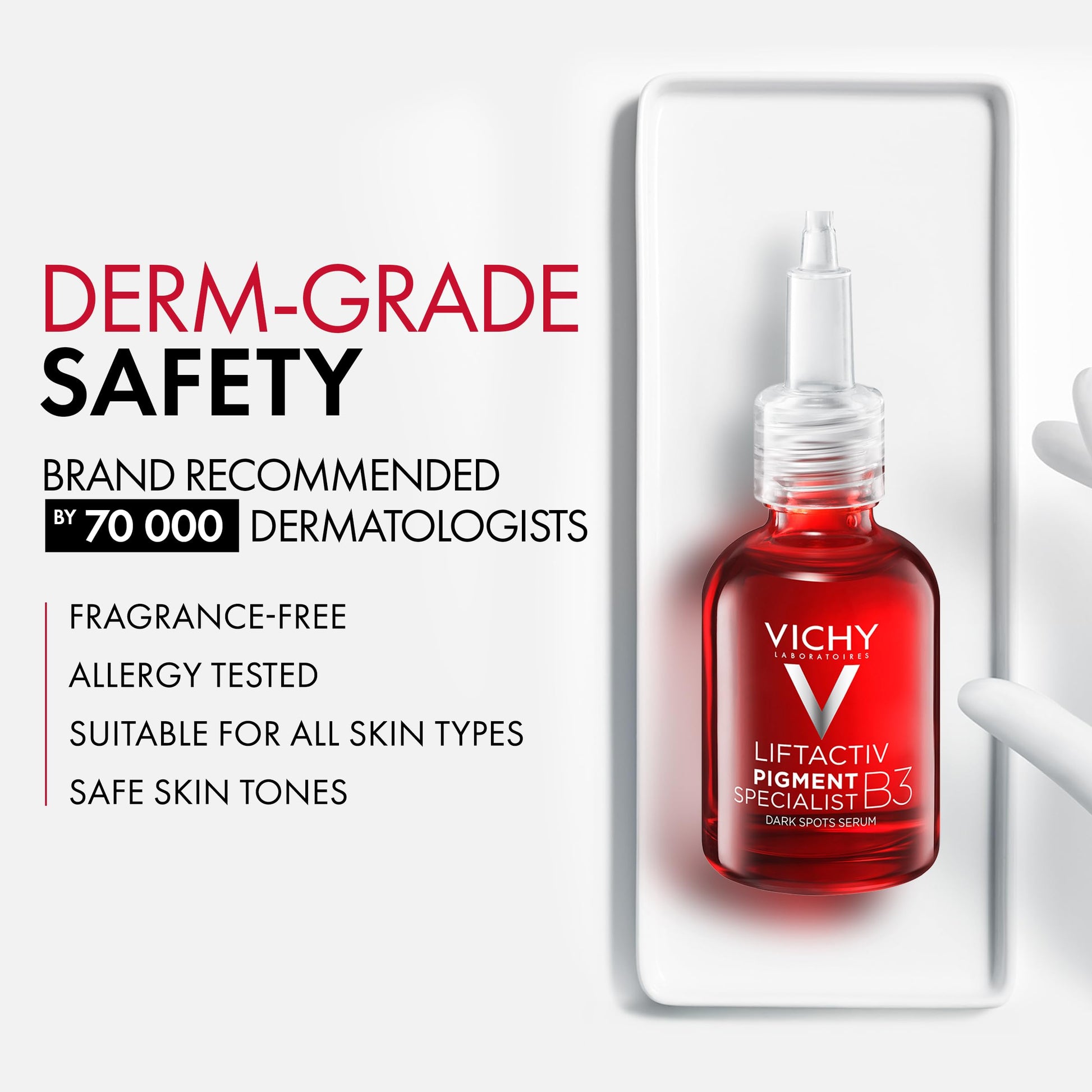 Discover Vichy's new & improved LiftActiv B3 Dark Spot Correcting Serum, a highly concentrated dark spot corrector for face, designed to address pigmentation concerns arising from sun exposure, pollution, or natural aging at every life stage. Now formulated with Melasyl, this facial serum acts as a comprehensive dark spot serum, leveraging 18 years of L'Oréal research to visibly reduce the appearance of existing dark spots & help prevent new ones from forming. It’s an ideal dark spot remover with a lightweight, quick-absorbing formula is designed for daily use, providing a bright & even complexion with enhanced skin clarity, revealing a smoother, more even-looking complexion for all skin types & tones, including sensitive skin. Benefits 97% agreed skin looked even* 93% agreed dark spots improved* Fragrance-Free, Paraben-Free, Silicone-Free Allergy-Tested, Dermatologist-Tested for Safety Suitable for all skin types & safe for all skin tones *Based on expert grading in a 14-week clinical study of 46 subjects. Key Ingredients 8% Niacinamide (Vitamin B3): Calms skin inflammation & helps soothe hormonal triggers, reducing the look of uneven skin tone & brightening the complexion. Glycolic Acid: Serum offers gentle exfoliation to help shed pigmented cells & promote skin renewal Melasyl™: A groundbreaking, patented ingredient that controls the overproduction of melanin, preventing new dark spots from appearing. Rainbow Algae: Reduces the transfer of pigment to the skin's surface, helping existing marks become less visible. Multi-layer Peeling Complex (HEPES, Glucouc, Urea): Gently renews & exfoliates old cells, revealing a brighter, clearer skin tone from within.